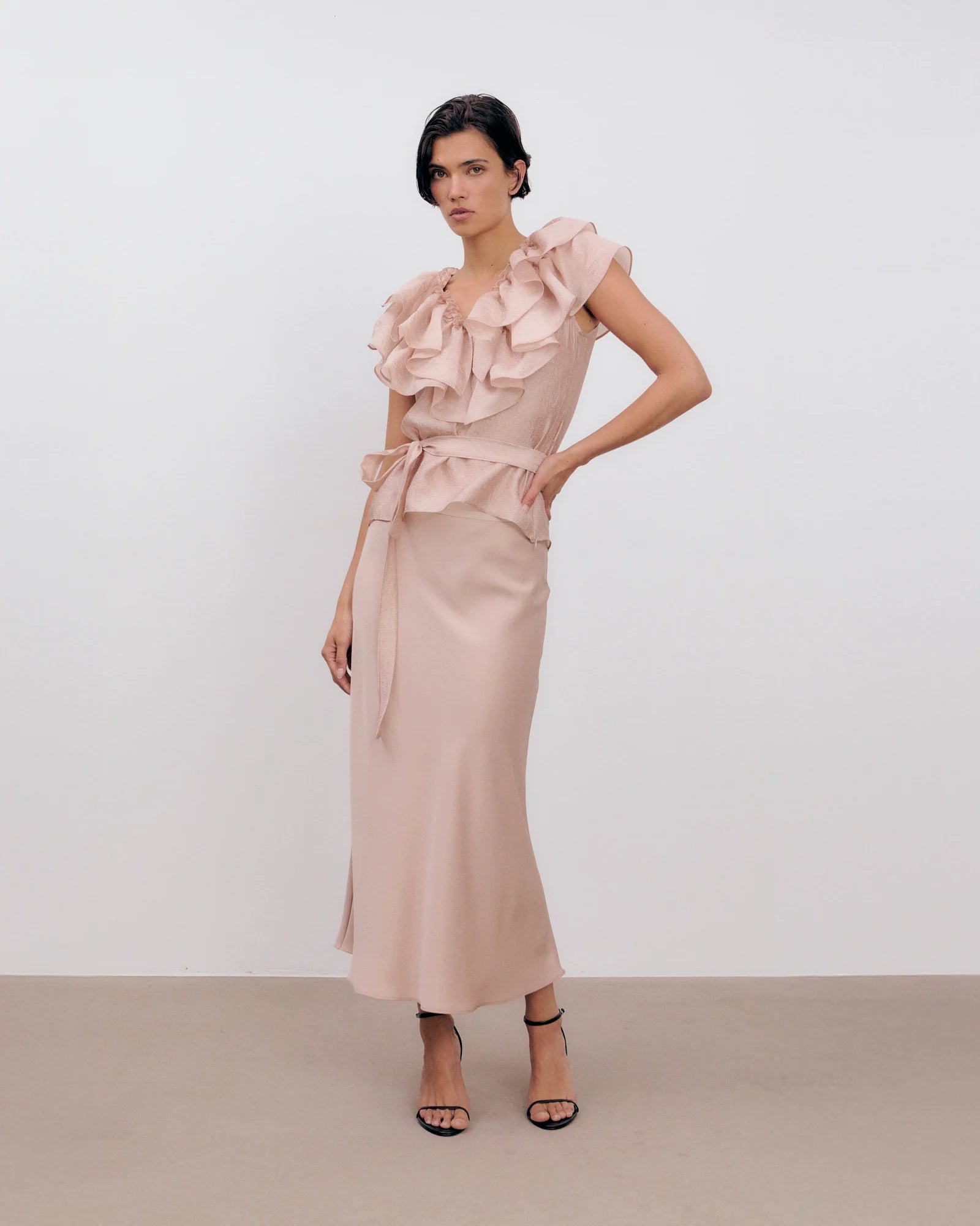 Eyra is a flirty and elegant top with a double-layered ruffled neck with a detachable waistband.