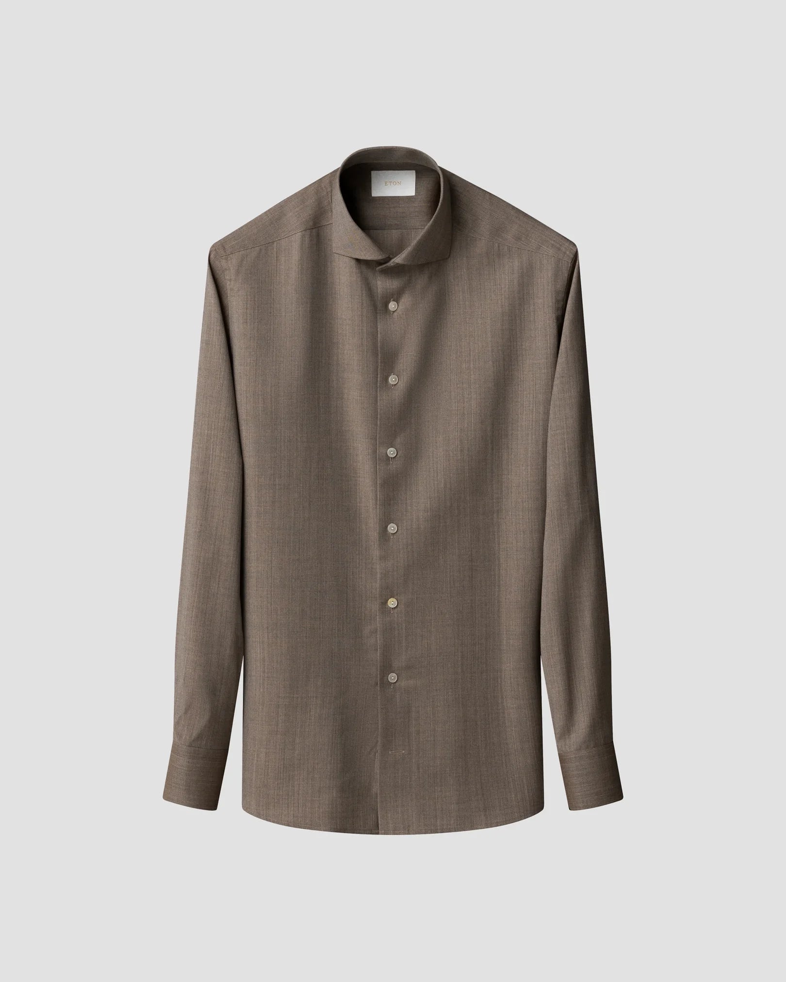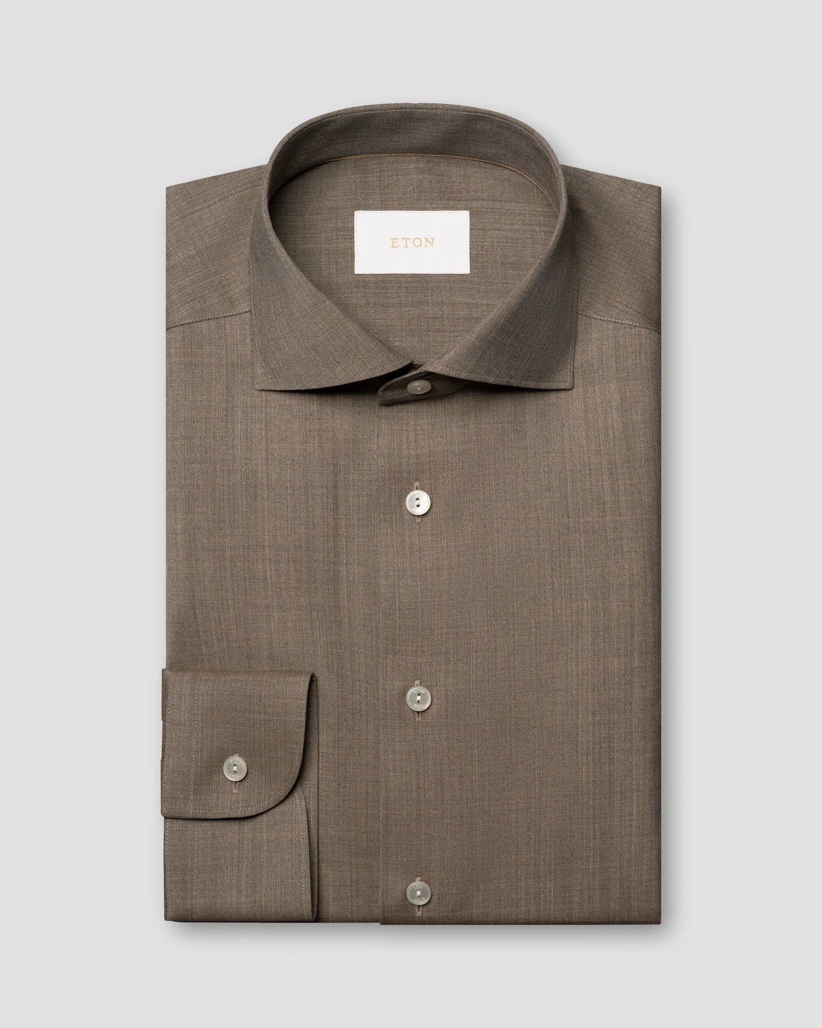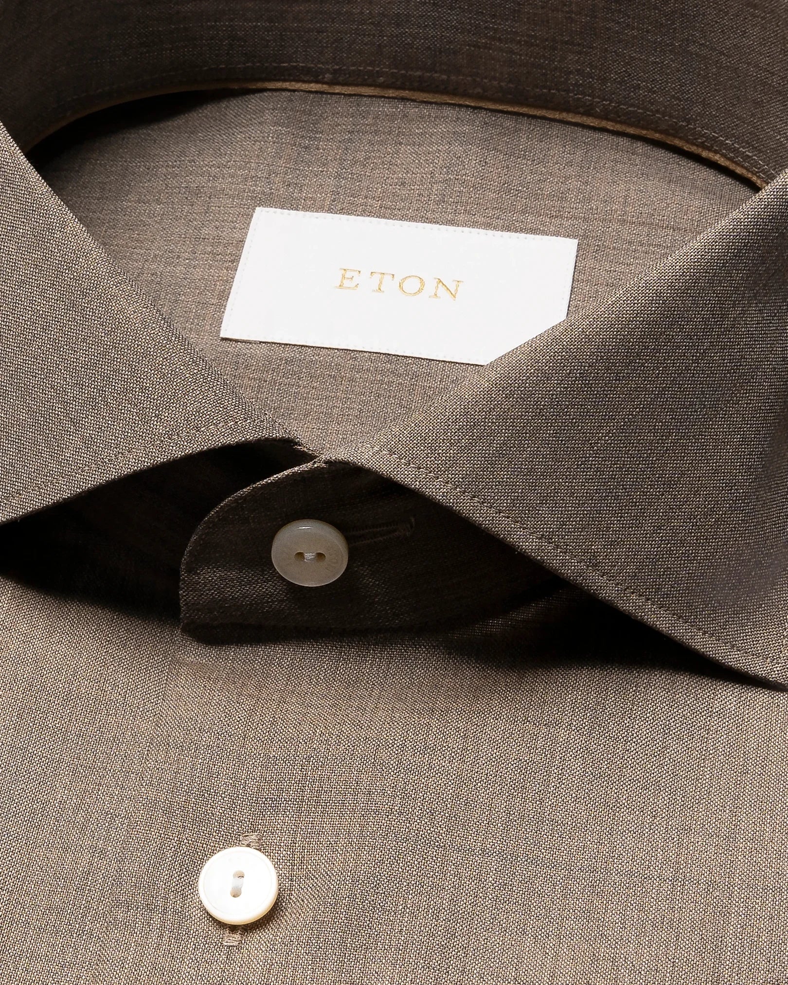 En enfärgad businesskjorta sydd i extra mjuk 100 % Super 120 merinoull, vävd i Italien. Den är värmereglerande med naturlig stretch och exceptionell andningsförmåga. Skjortan är strykfri och kan tvättas i maskin. Med pärlemorknappar och strukturerad textur är den en elegant variant på smart casual-stilen.