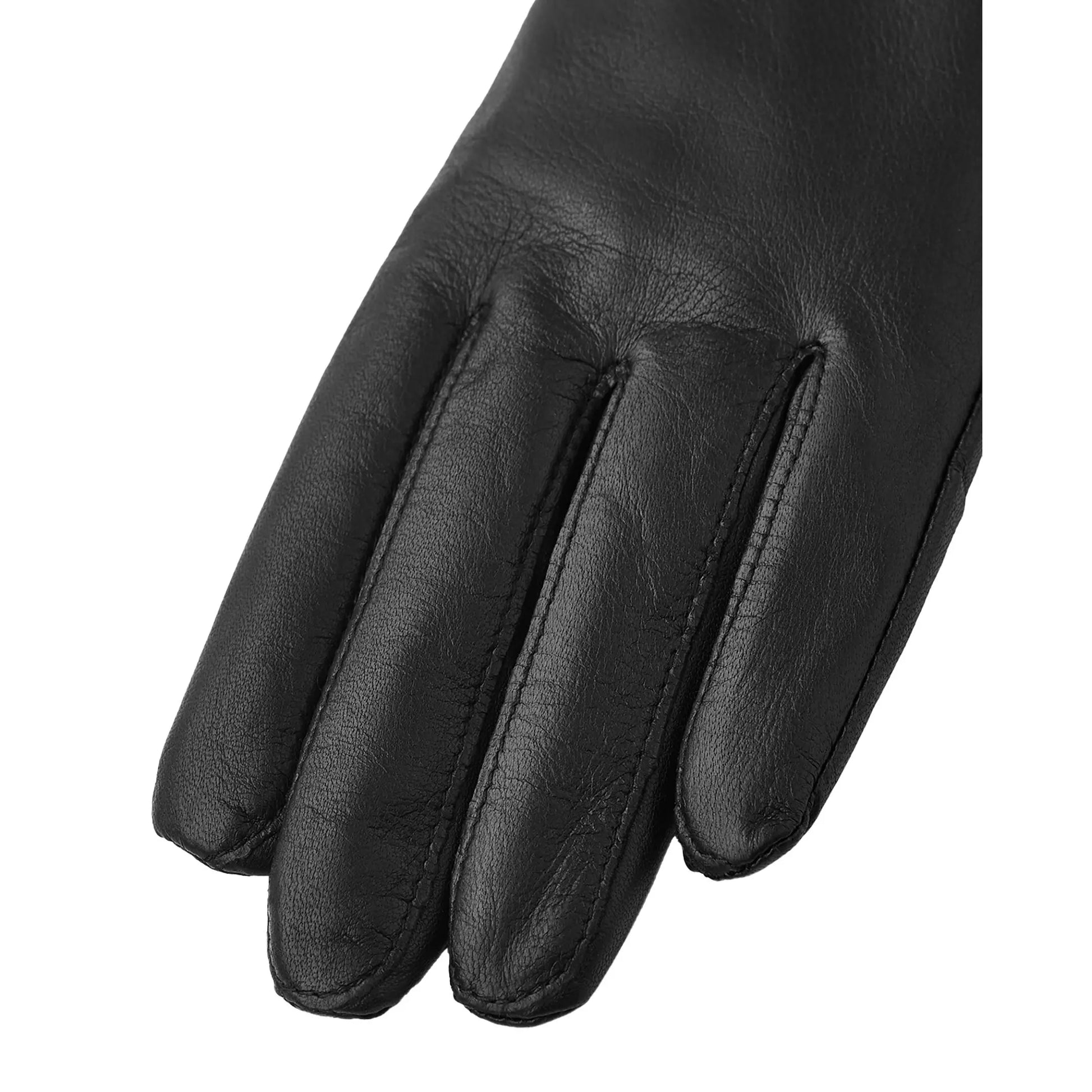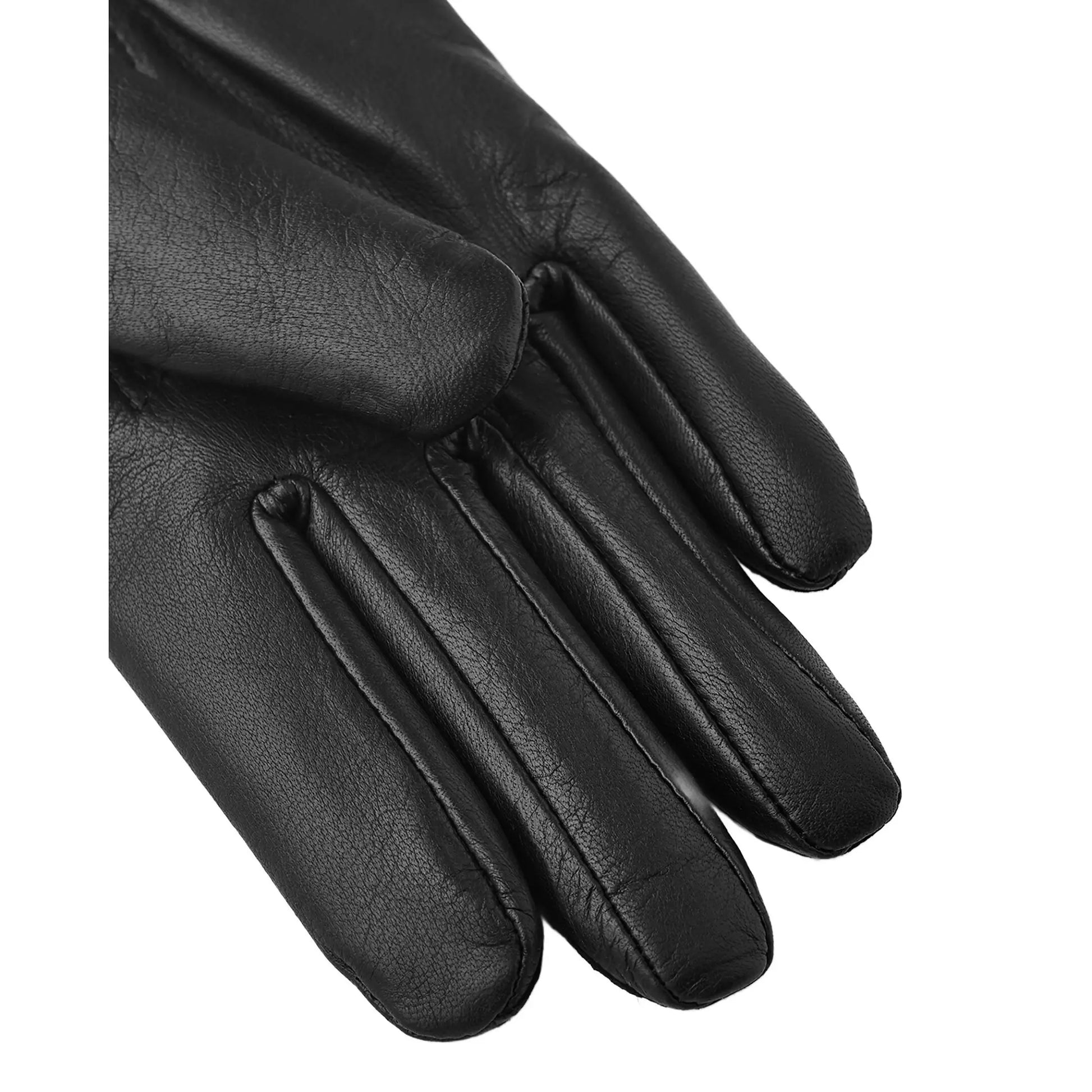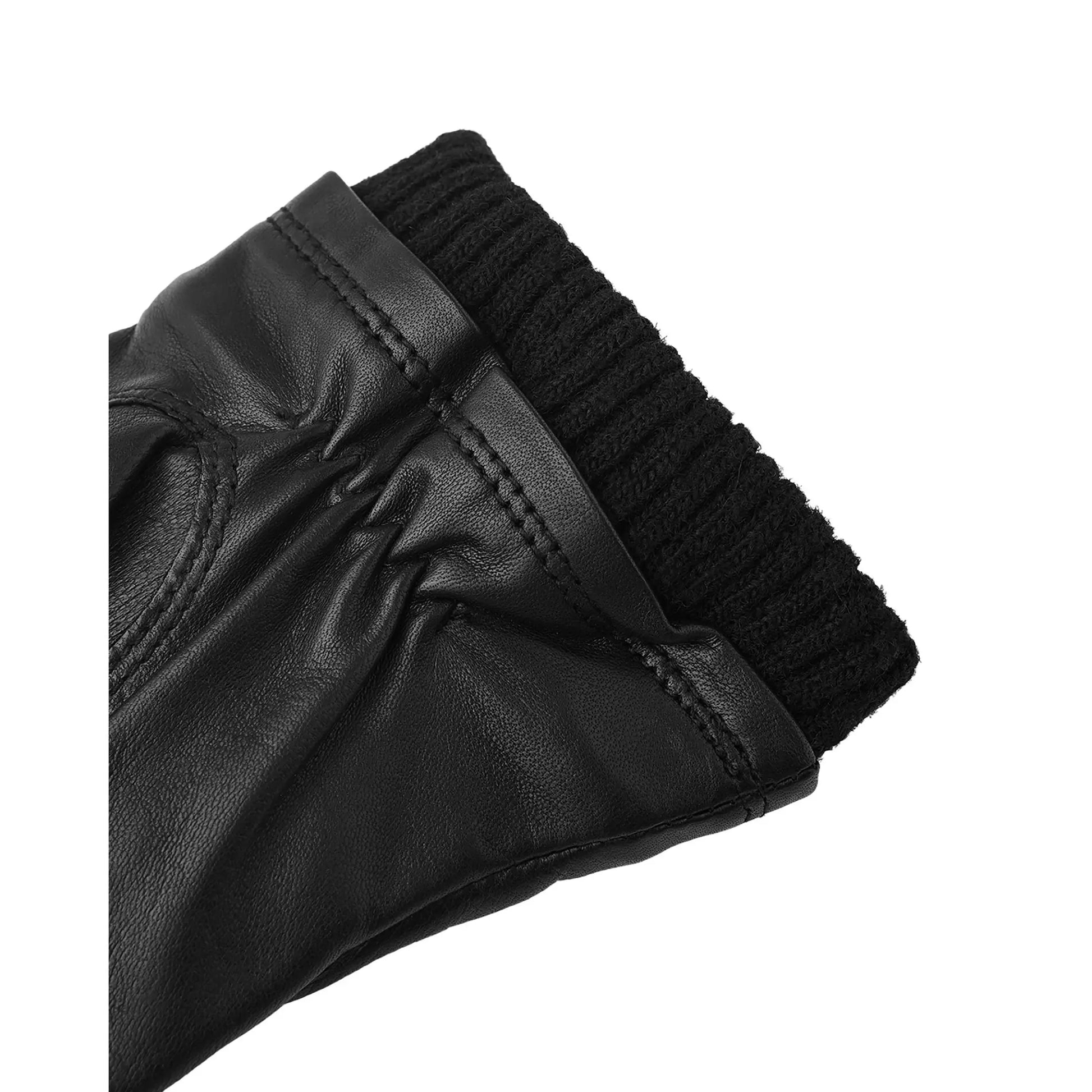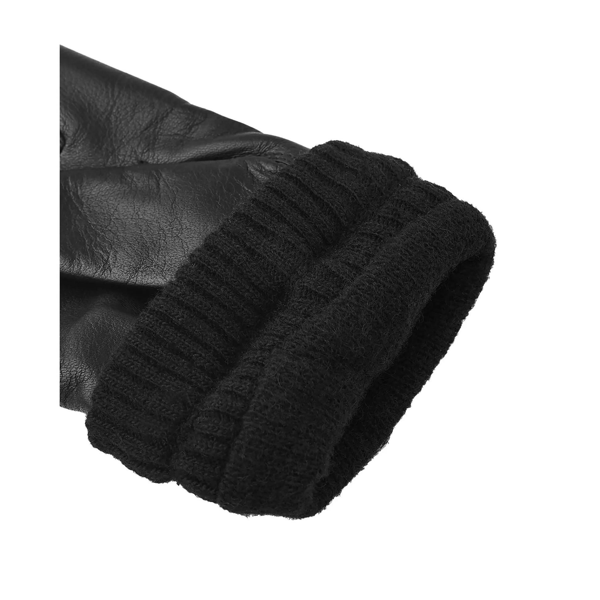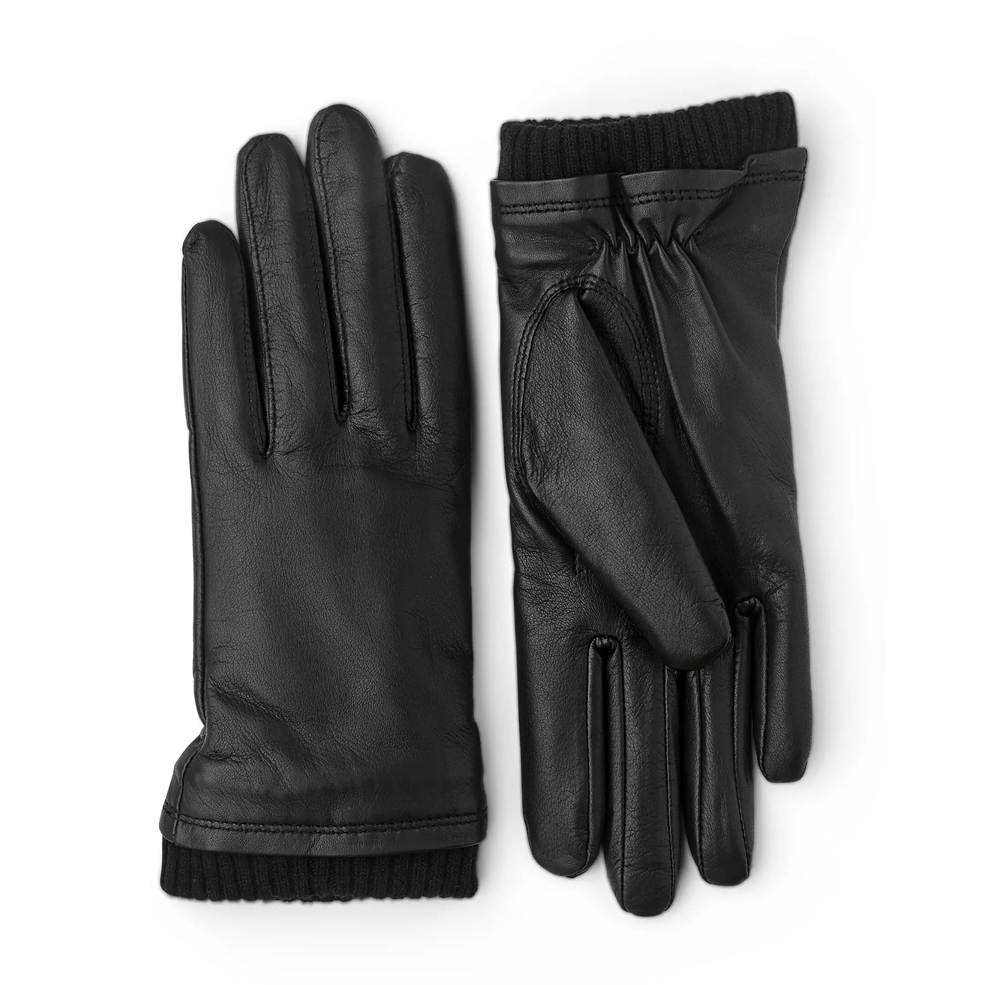 Svarta handskar i skinn med ribbstickad mudd från Viska. Sydd i mjuk, stretchig lammnappa med handnära passform och en liten resår på handledens insida. Ett mjukt stickat foder i ullmix ger lätt värme under småkyliga höst- och vinterdagar.