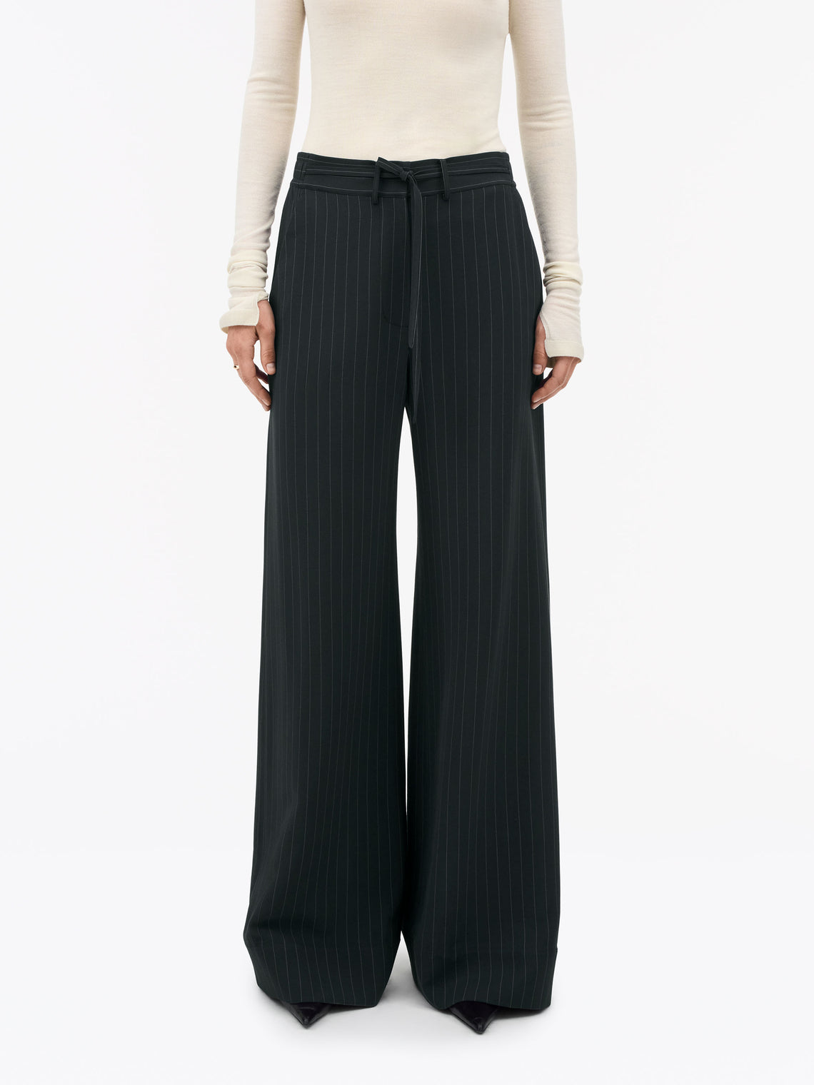 Byxorna är tillverkade i ett skräddarsytt, draperat mellanviktsmaterial som kombinerar struktur med lätthet. De har en avslappnad passform och en subtilt utsvängd silhuett och sitter mitt i midjan med en elastisk baksida för extra komfort. På framsidan finns en gylf med dragkedja och kardborreknäppning, medan fästbanden med knytband och bälteshällor i midjan ger en justerbar styling. Snedställda fickor framtill och passpoalfickor baktill ger funktionella detaljer och den höga, vikta fållen ger en raffinerad, modern touch.
