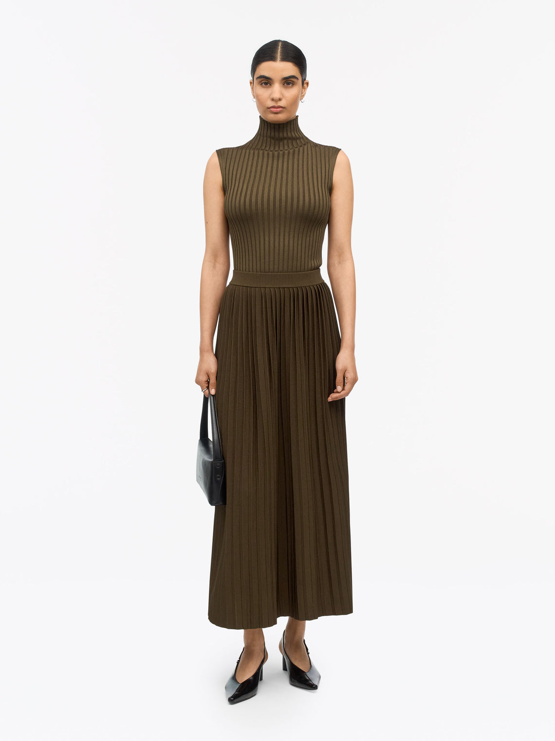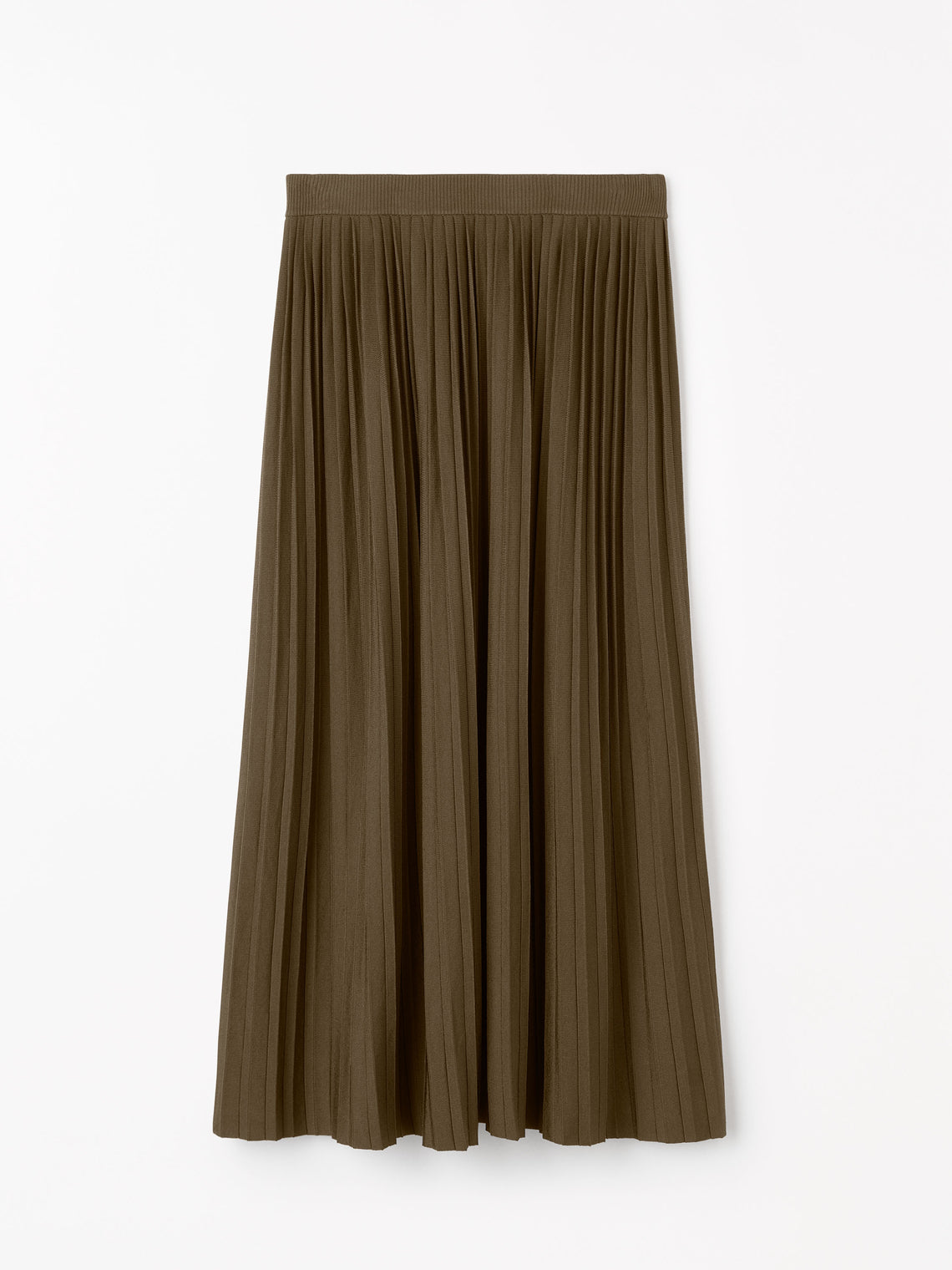 The Olivia pleated skirt is crafted from a soft viscose blend, designed with timeless elegance in mind. Falling at calf length, this mid-waisted, classic pleated skirt offers effortless sophistication for everyday wear. The integrally knitted waistband ensures a comfortable fit, while the skirt itself is knitted in a smooth jersey stitch for graceful movement and flow. Unlined for lightness, Olivia combines modern comfort with a refined silhouette.
