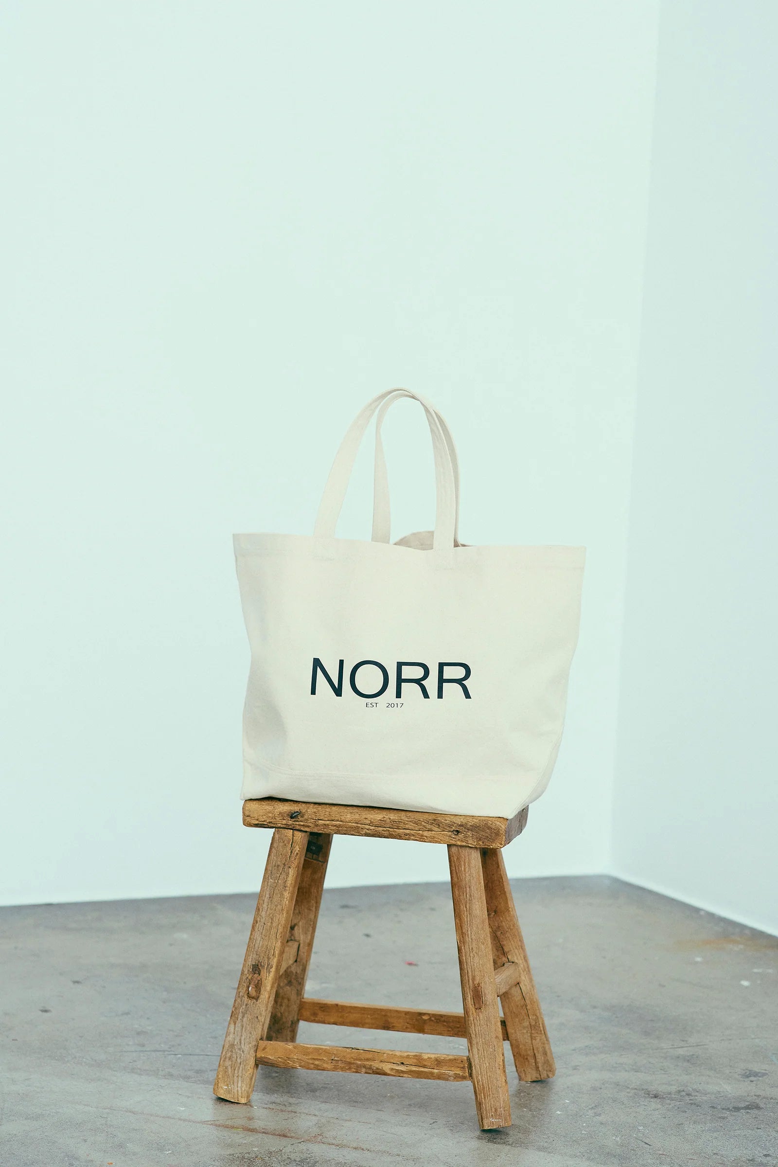 The NORR tote is a minimalist and practical carry-all, crafted from durable cotton in a natural ecru tone. Featuring the bold NORR logo and a spacious interior, it's perfect for daily errands or casual outings.