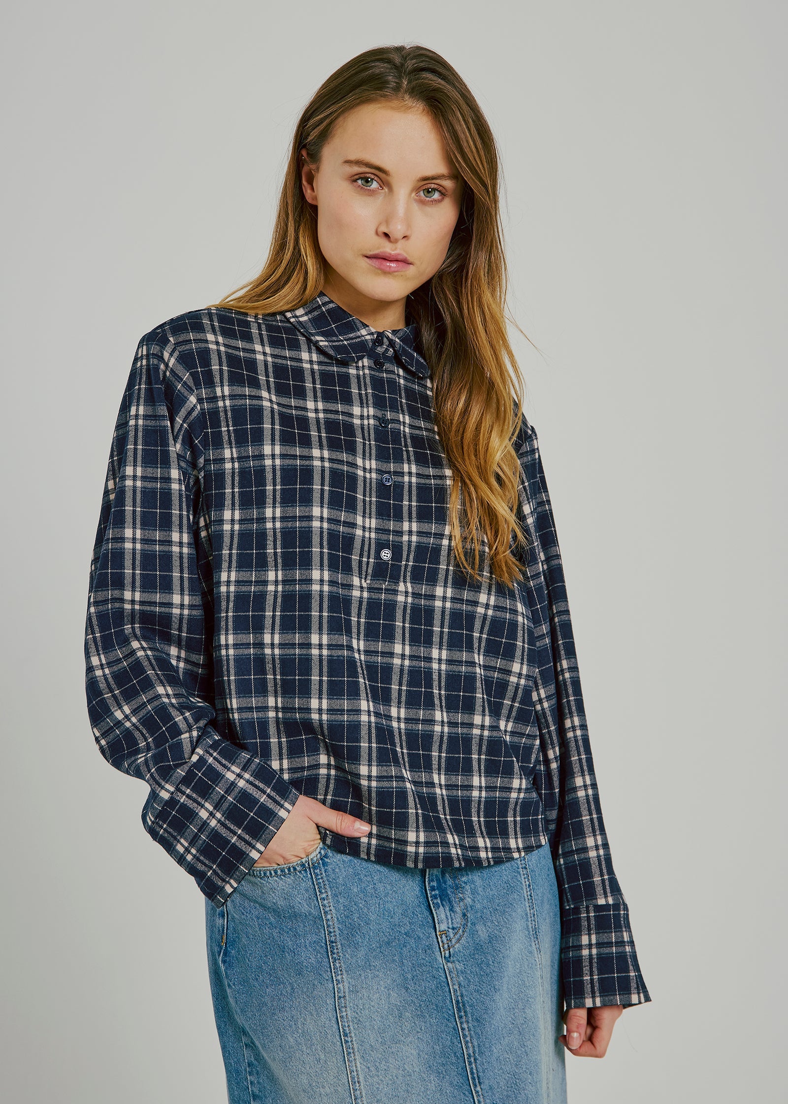 The Sylvana top features a classic checkered pattern with a relaxed fit and button-down front. Its timeless design and soft fabric make it a versatile piece, perfect for casual and layered looks.