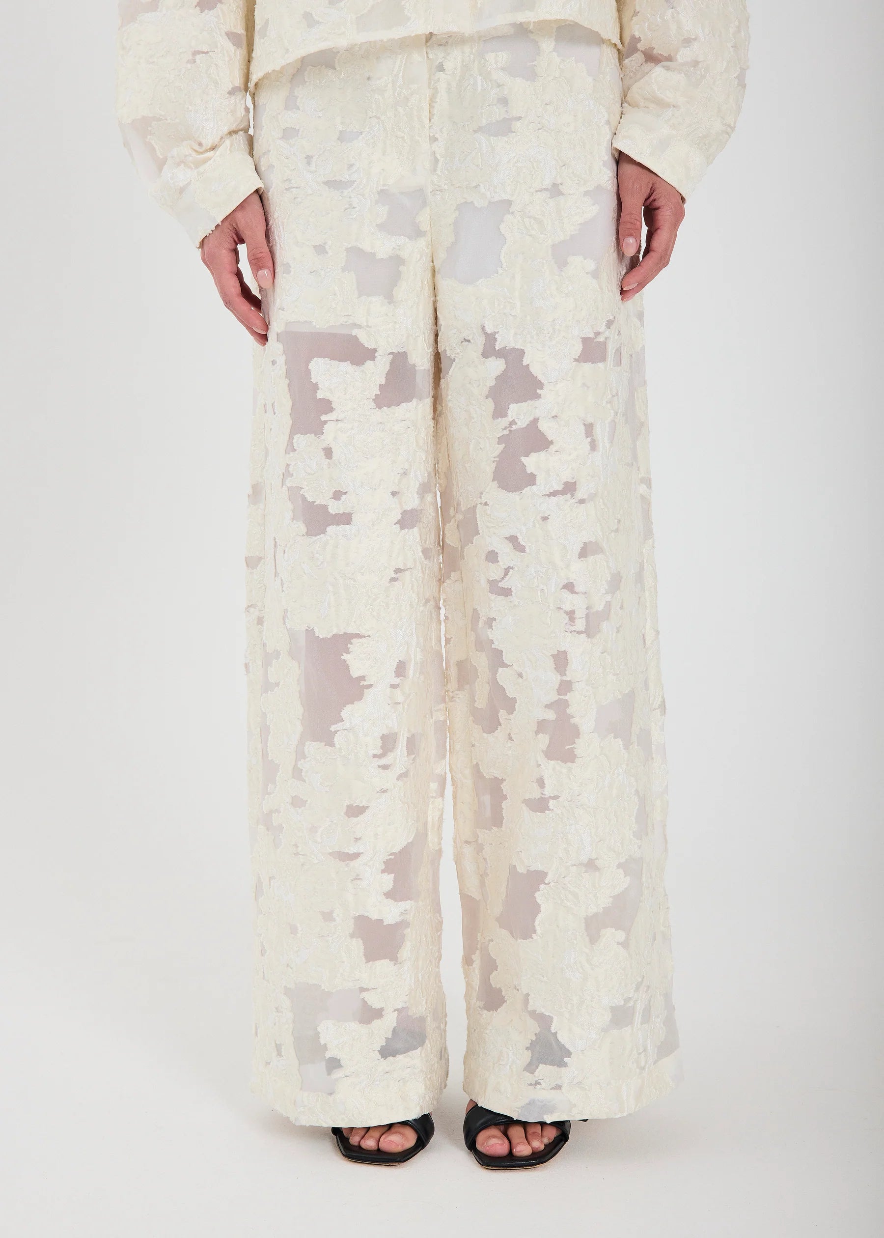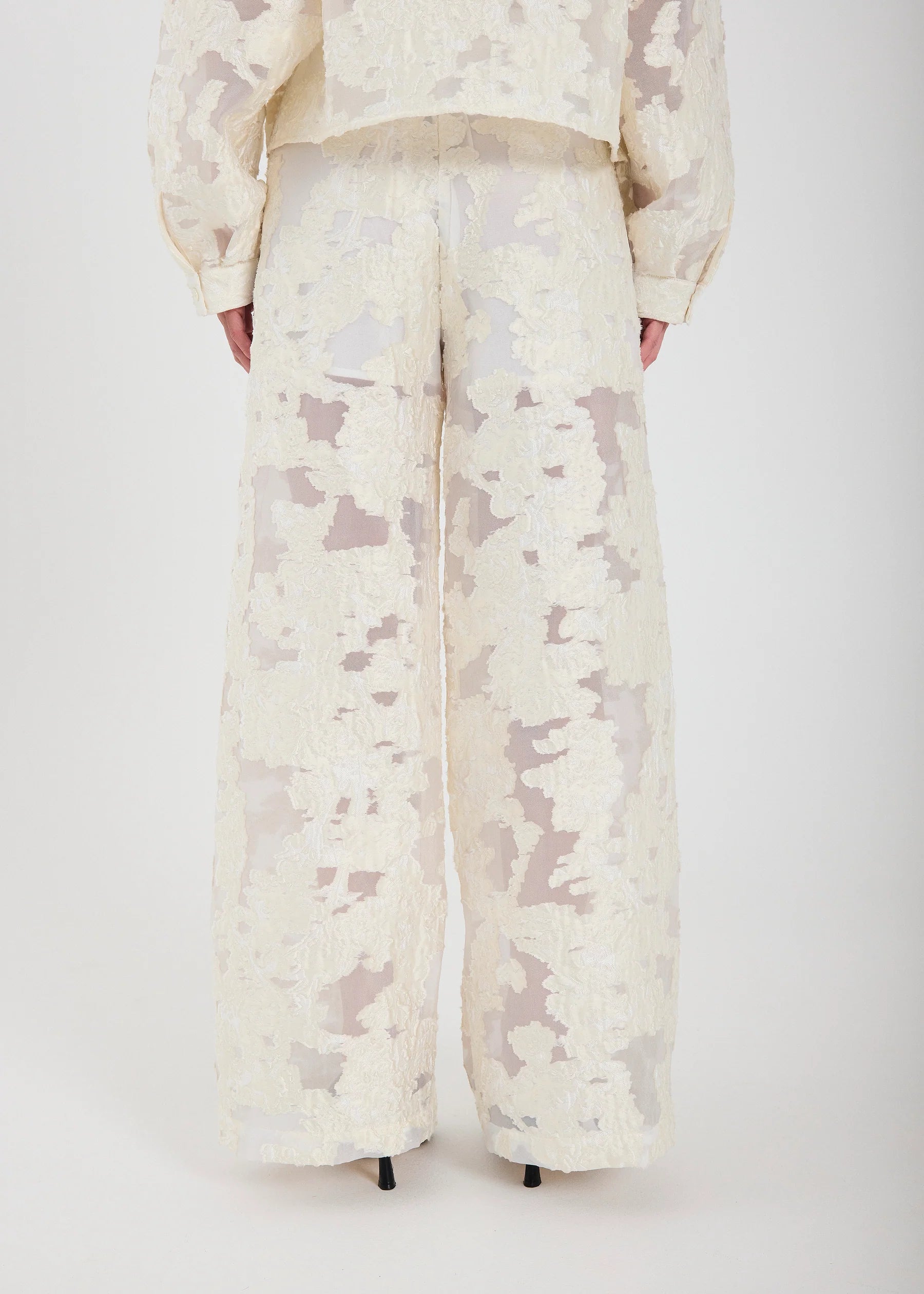 These wide-leg trousers are crafted from a lightweight sheer fabric with all-over embroidered floral detailing, creating a refined and feminine look. The design features a smooth waistband for a clean finish, discreet side pockets, and a relaxed fit that flows beautifully when moving. Style them with the matching blouse for an elegant set or pair with a simple top to let the embroidery stand out.