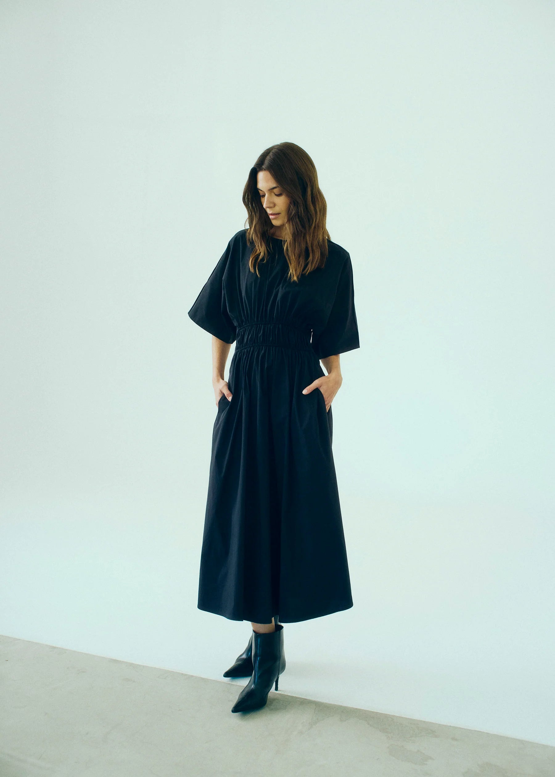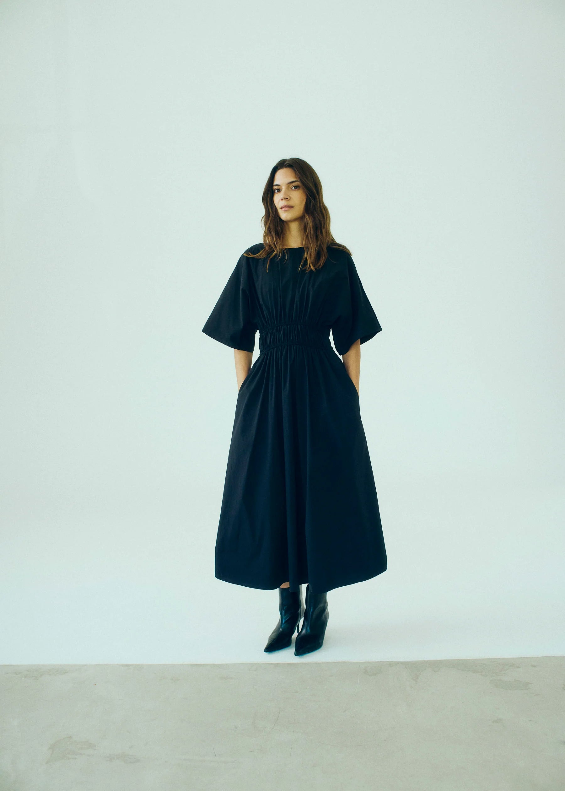 This elegant midi dress is designed in a regular fit with a flattering, voluminous skirt that creates a feminine silhouette. The wide ¾-length sleeves add a touch of modern drama, while the round neckline keeps the look clean and timeless. Crafted from a crispy cotton blend, it’s the perfect piece for both everyday wear and evening occasions.
