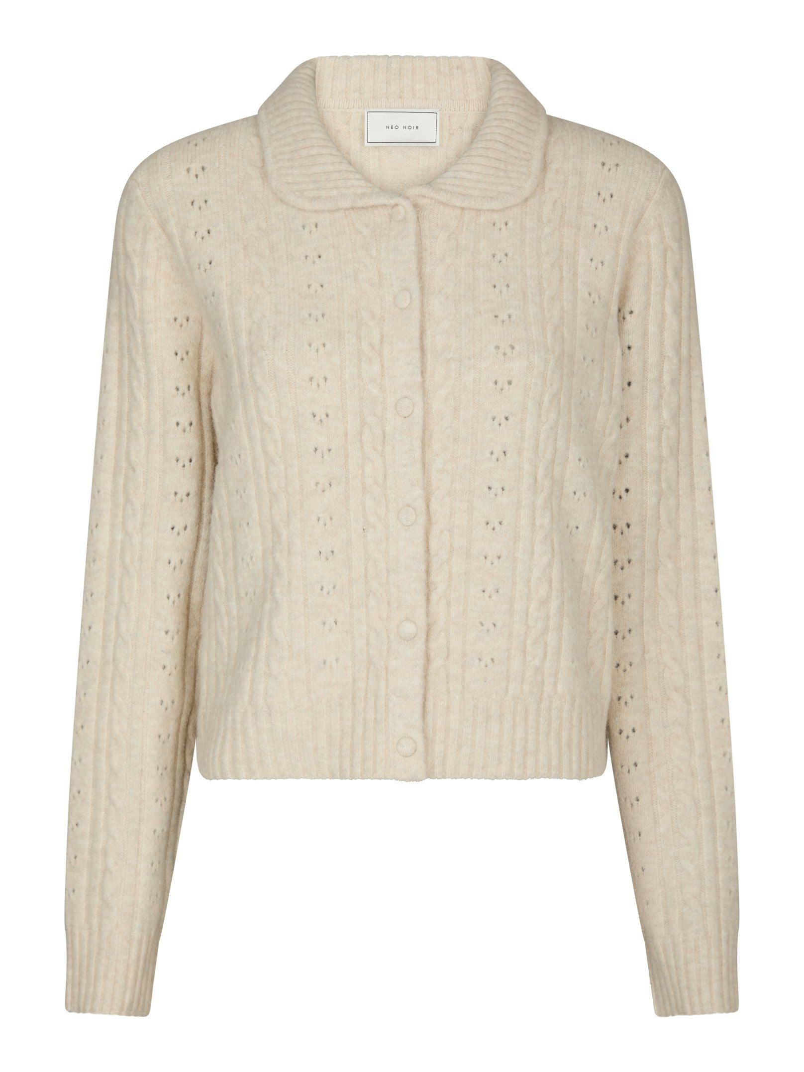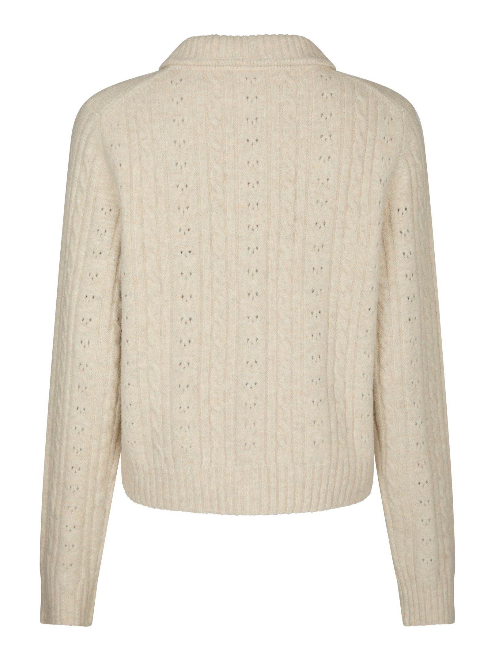 En härlig stickad kofta med krage och knappar längs fram. Koftan har en vacker stickning. Modellen är 176 cm lång och bär storlek 36.