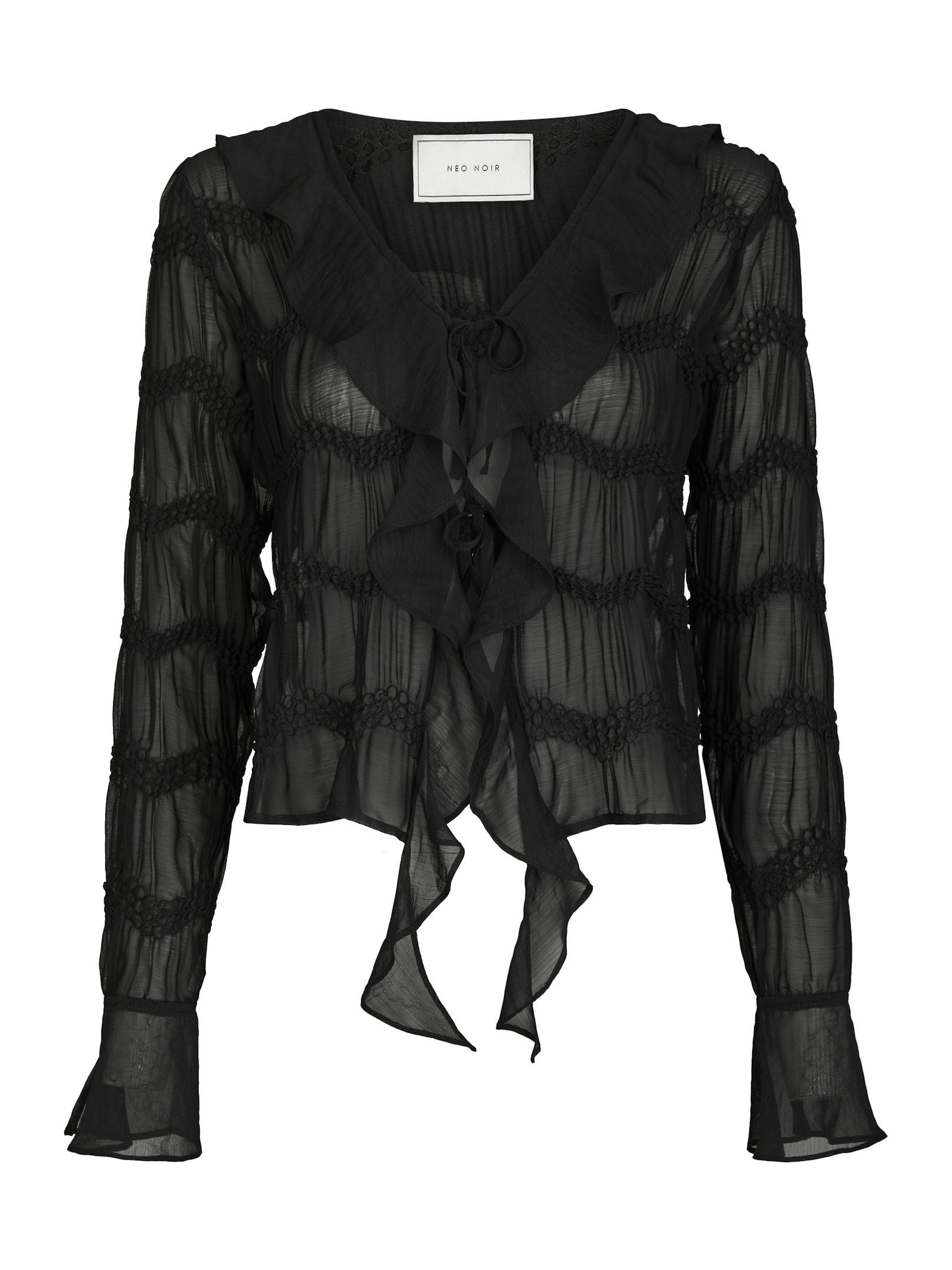 Blus med V-ringning, volanger och knytdetaljer fram i strukturerad bubbelkvalitet. Modellen är 176 cm lång och bär storlek 36.
