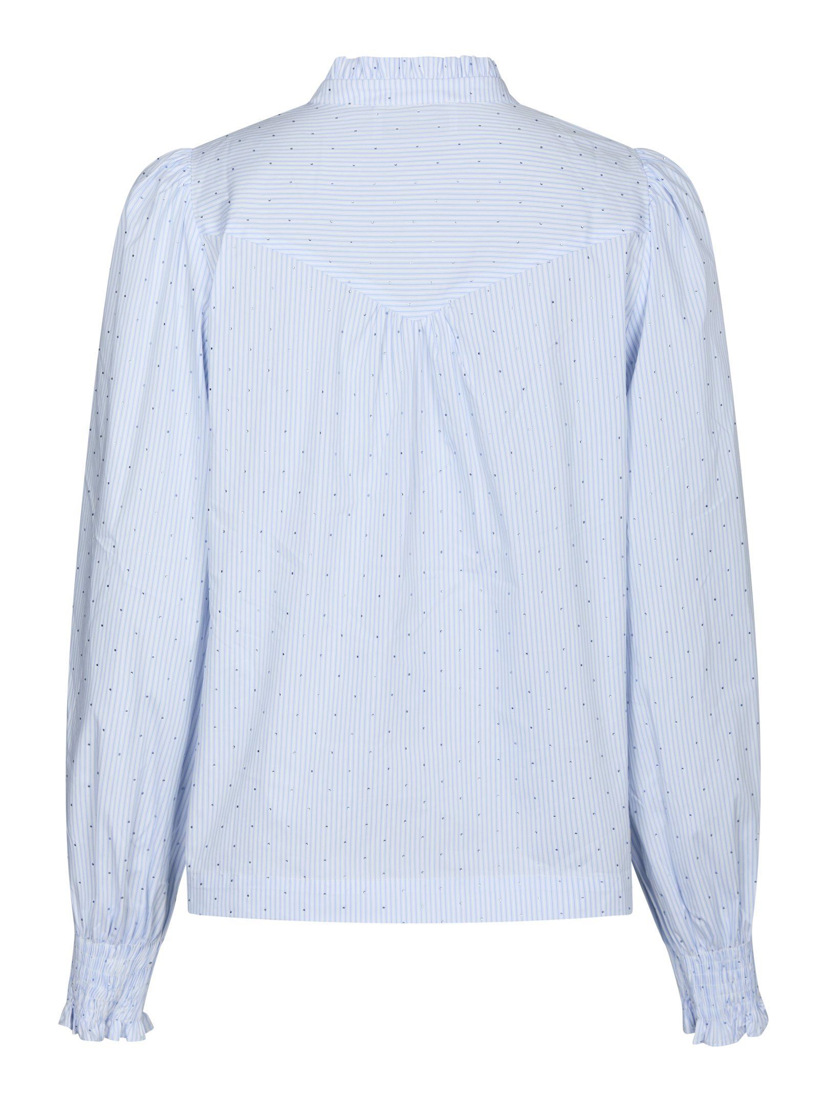 Blus med smockärmar, krage med volang och knäppning fram. Tyget är randigt med rhinestones. Modellen är 176 cm och bär storlek 36.