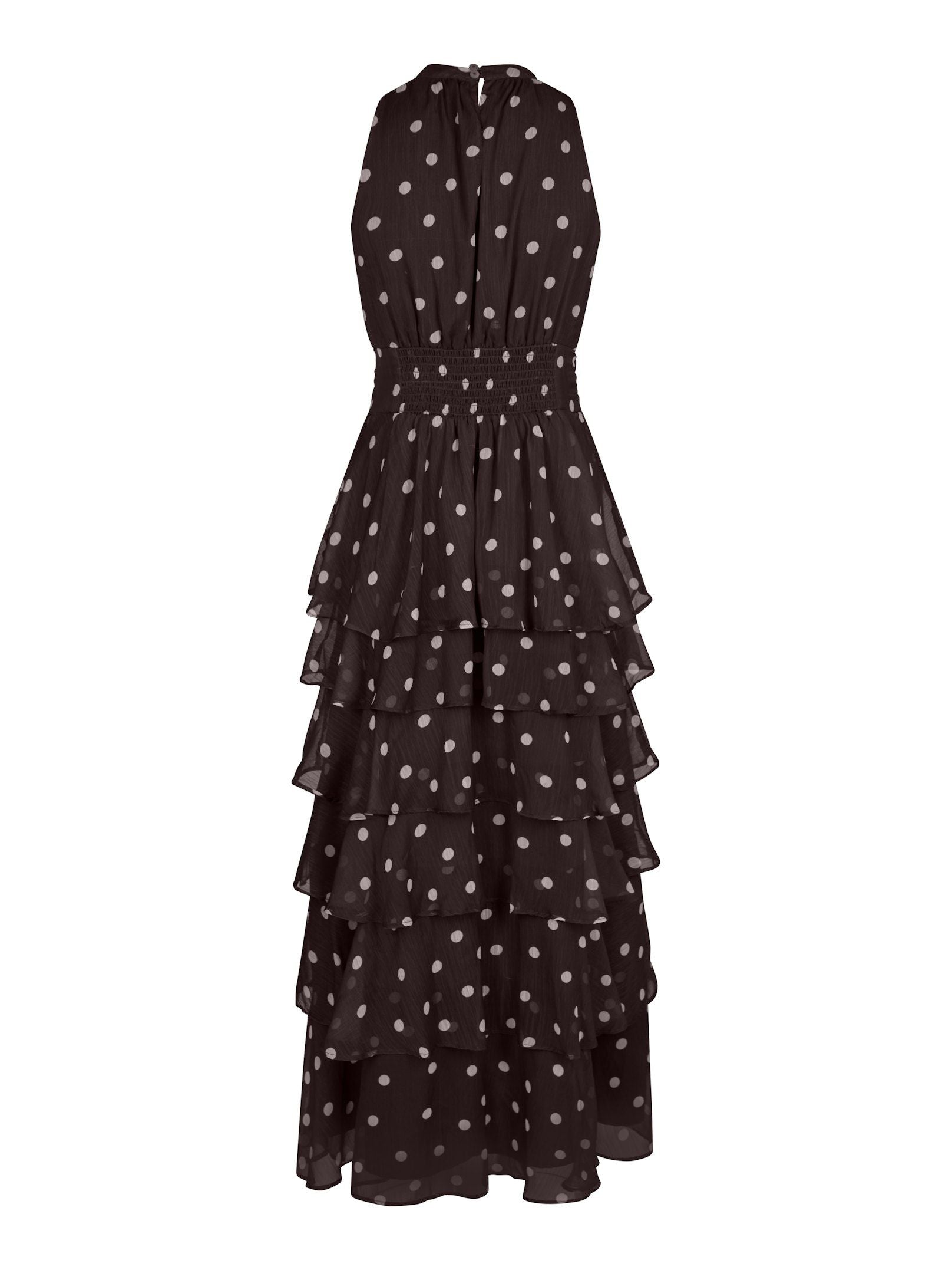 Fin lång klänning med prickar som knyts i nacken. Klänningen har smock under bysten och en lös kjol i botten. Modellen är 176 cm lång och bär storlek 36.