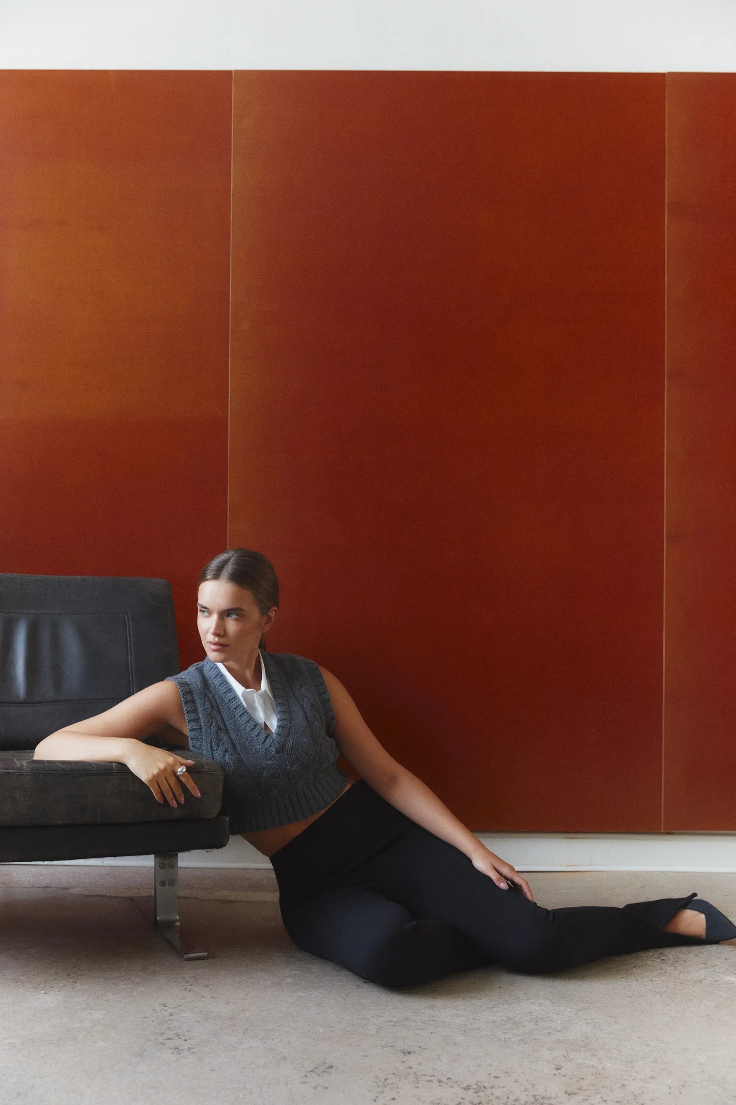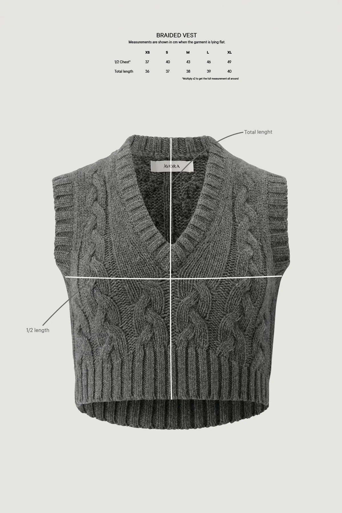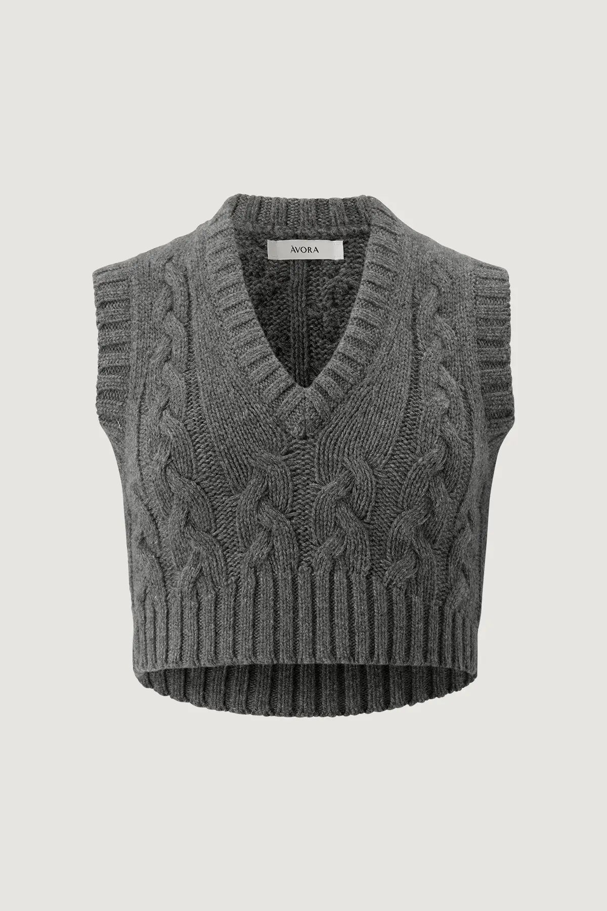 The Braided Vest is a cropped knitted vest adorned with a full braid knit. It has a V-neckline and rib detailing around the neck, sleeve holes, and bottom. The product is true to size - size up for a looser fit.