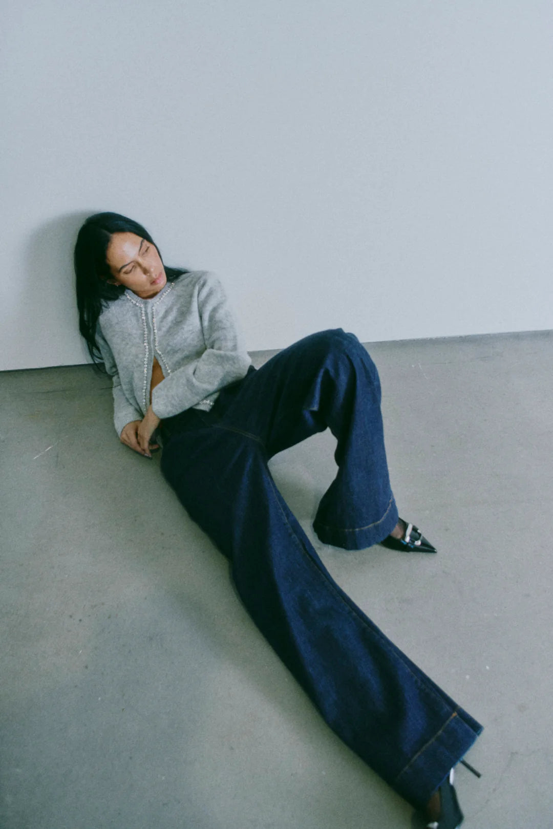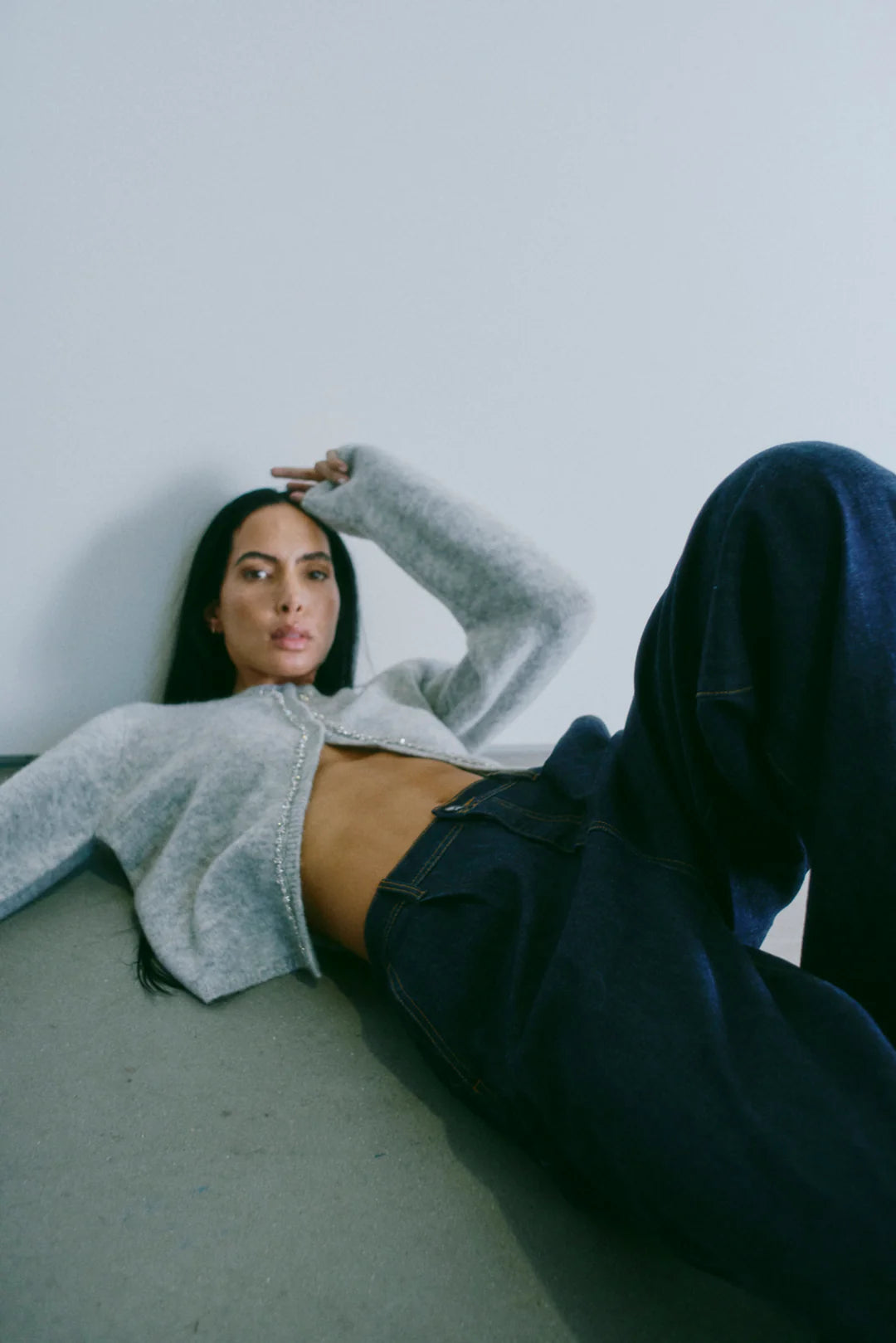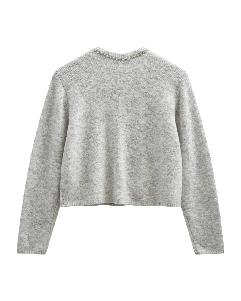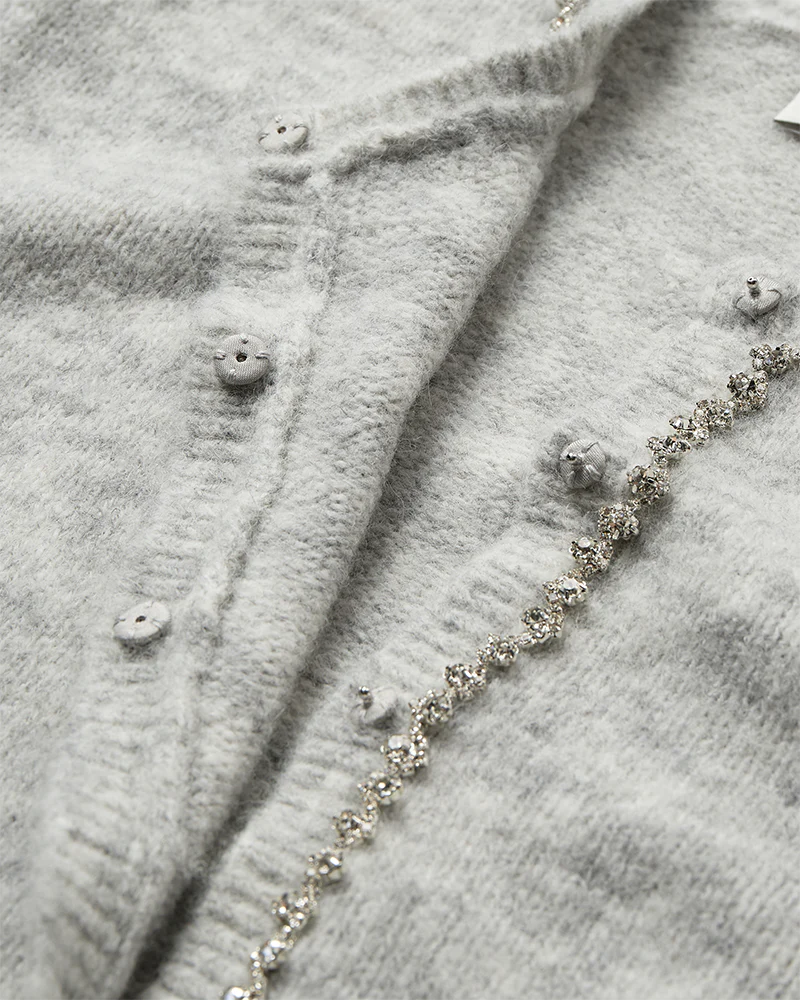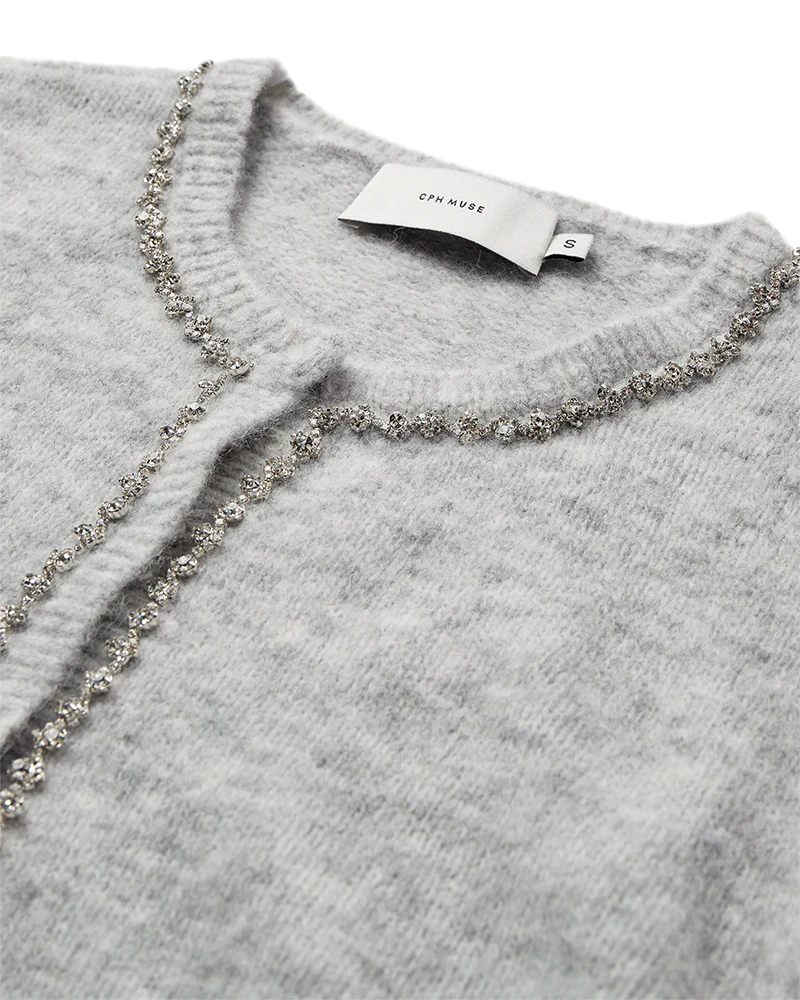 CMIBRA-CARDIGAN is a short, wide cardigan in a premium, knitted material with long sleeves, a concealed snap fastening at the top, narrow ribbing as well as elegant rhinestones along the neckline and front.