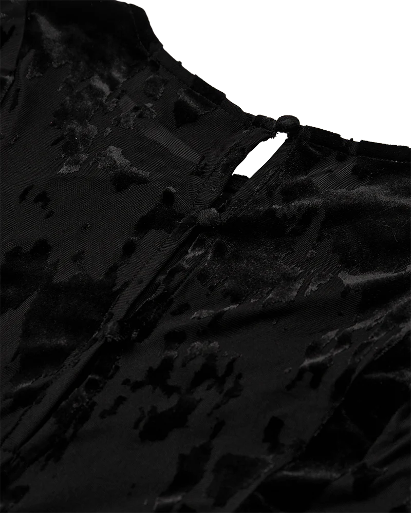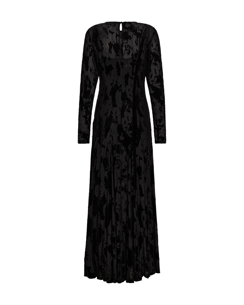 CMFLAME-DRESS is a dress in an elegant mesh material with an all-over flock effect, a tight fit, long sleeves, button fastening in the neck, a slip and a wide skirt.