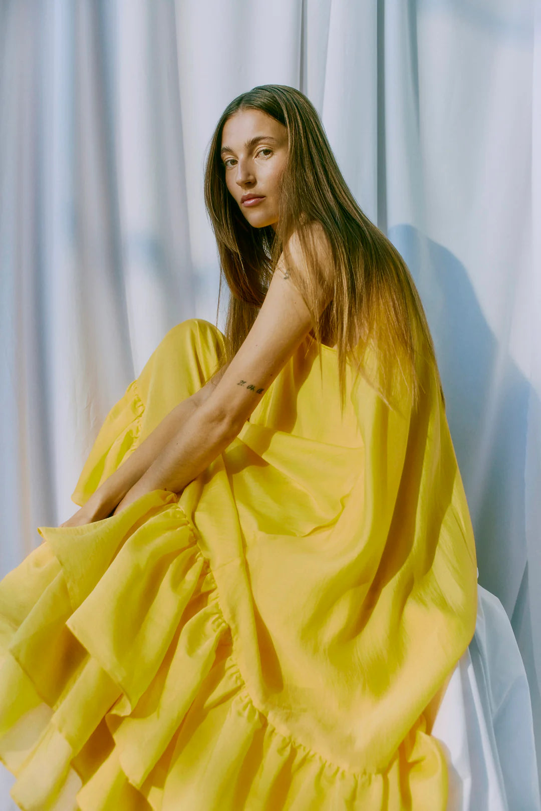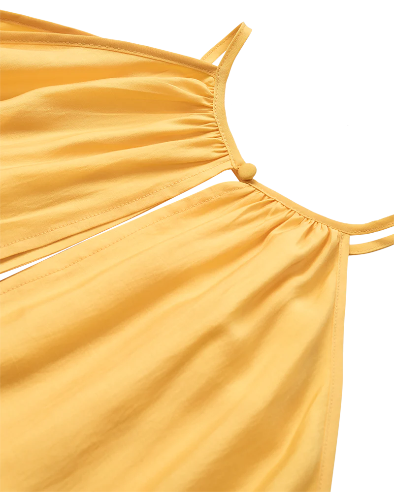 CMMOLLY-DRESS is a voluminous long dress crafted in a woven lyocell blend with a soft, fluid drape. The halterneck design features a narrow V-neckline at both front and back with gentle gathering at the neckline. At the back, the neckline is finished with small fabric-covered buttons as a delicate detail. The silhouette is cut in a flowy A-line with generous volume, creating beautiful movement. A tiered ruffle hem adds extra fullness to the skirt. Fully lined and designed with discreet side seam pockets for everyday ease.