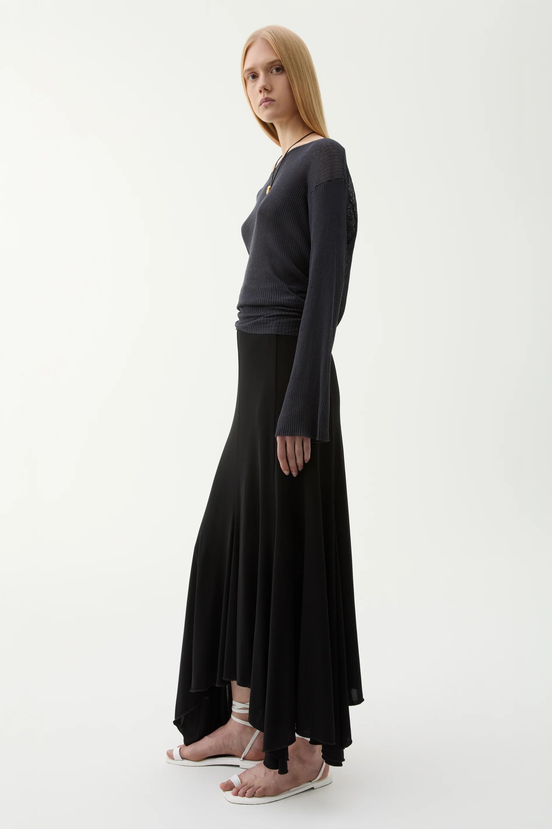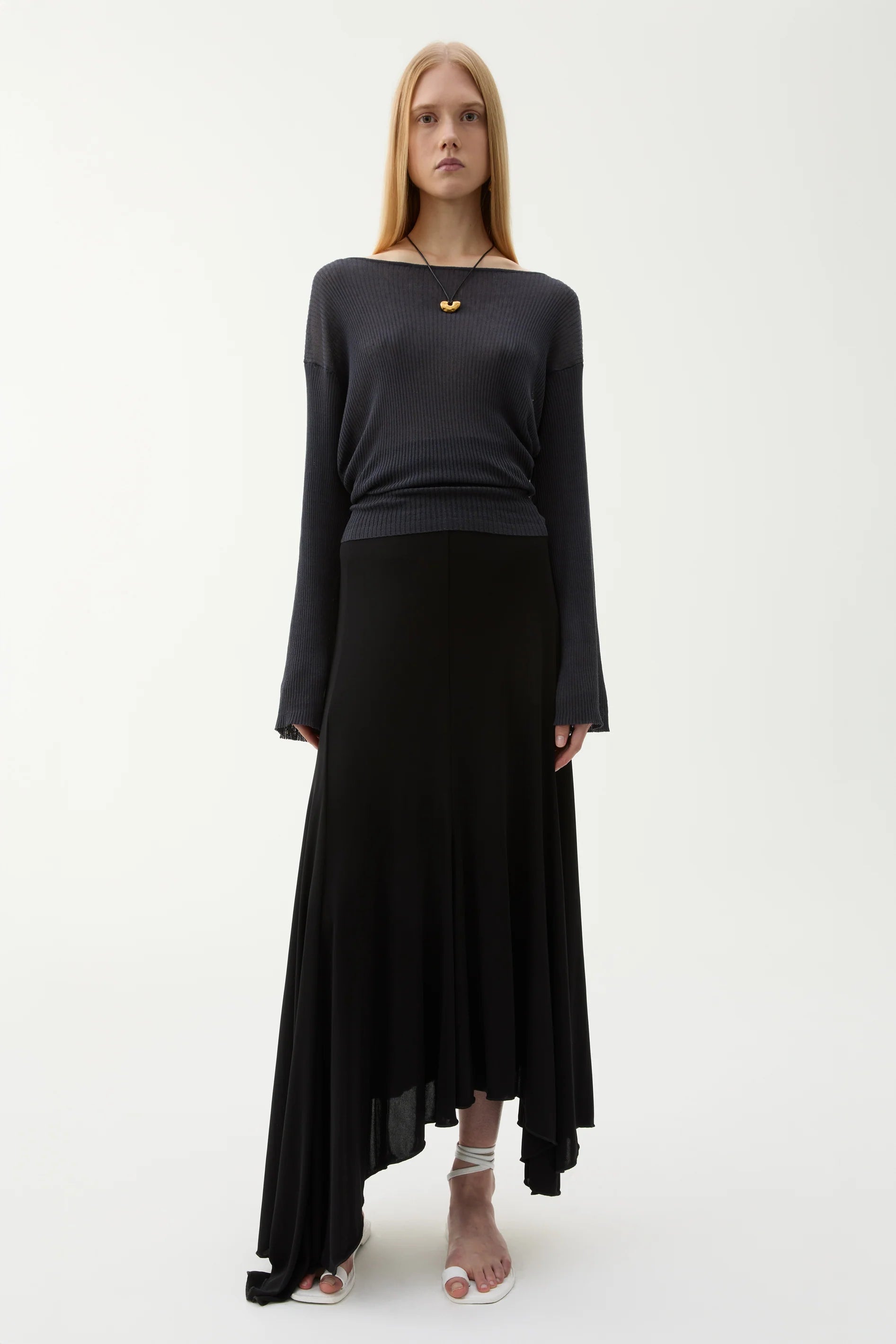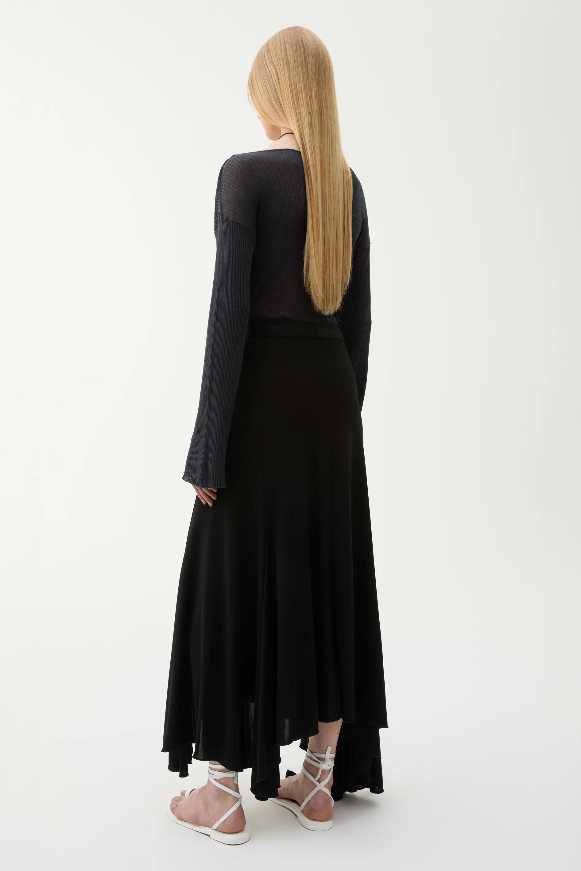With its flowing silhouette and fluid jersey fabrication, the Sandy skirt is essential for the ‘Strict Hippie’ wardrobe. It has an elasticated waistband for optimal comfort, and falls with gentle folds towards its asymmetrical hemline. Emphasize the movement of this piece by styling with draped blouses.