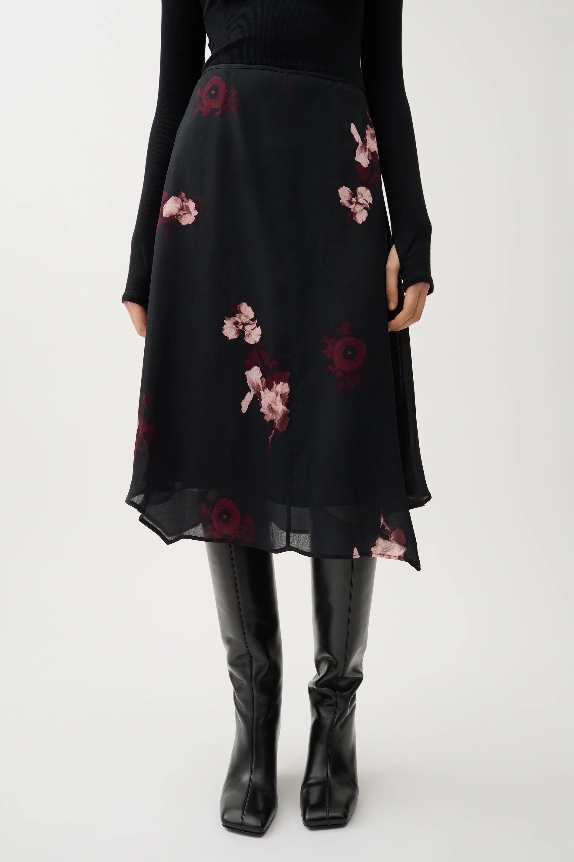 Illustrated with Rodebjer’s seasonal Bouquet print, the Amalia skirt will speak to ‘Strict Hippies’ everywhere. Made from crêpe with a fluid handle, it fastens discreetly with a zip at the back, before falling to an asymmetrical hemline. Pair with an expressive knit to tap into the mood of the moment.