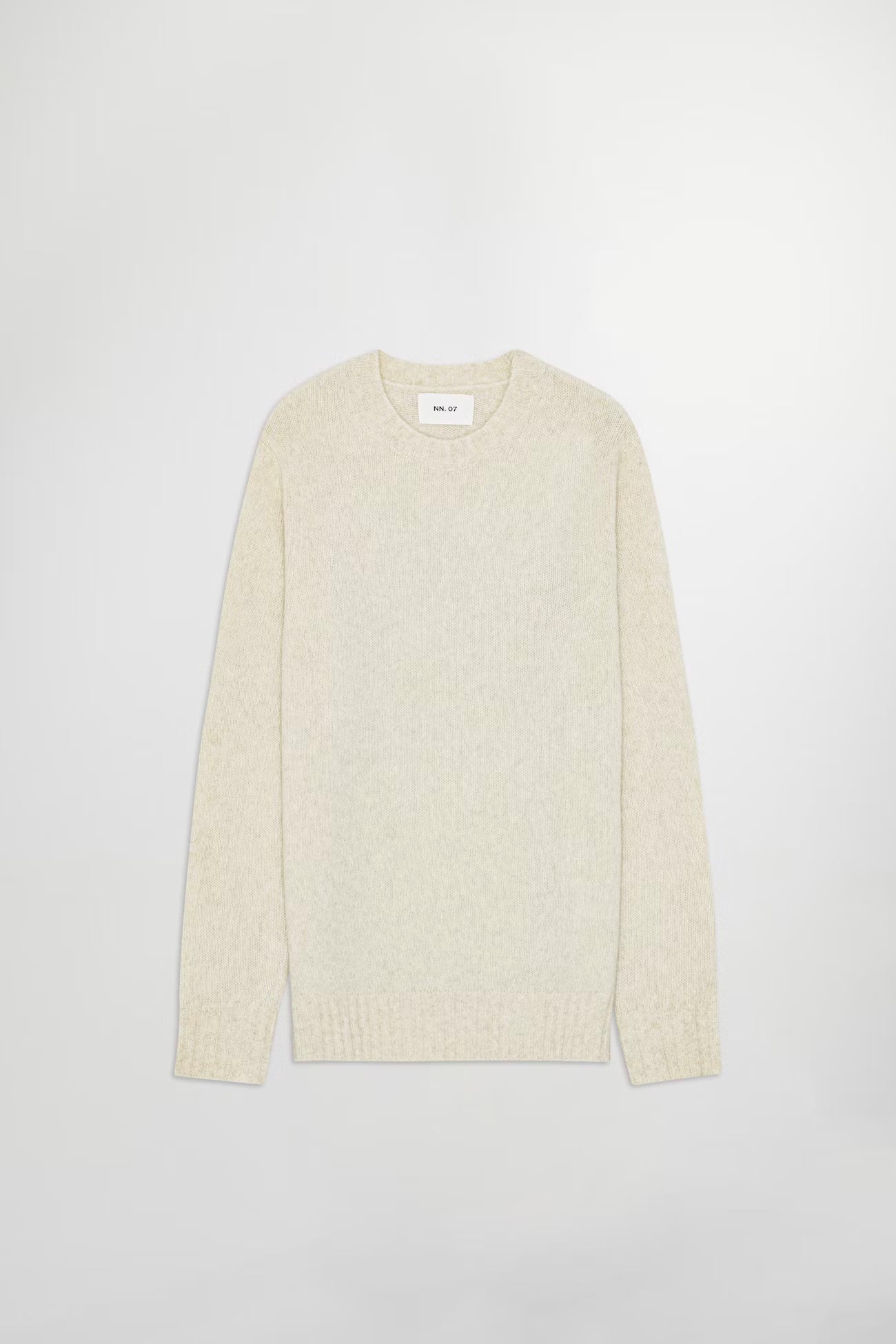 Tröja i ullblandat tyg med axelparti som faller bakåt, diskreta modemärken och bred ribbstickning.