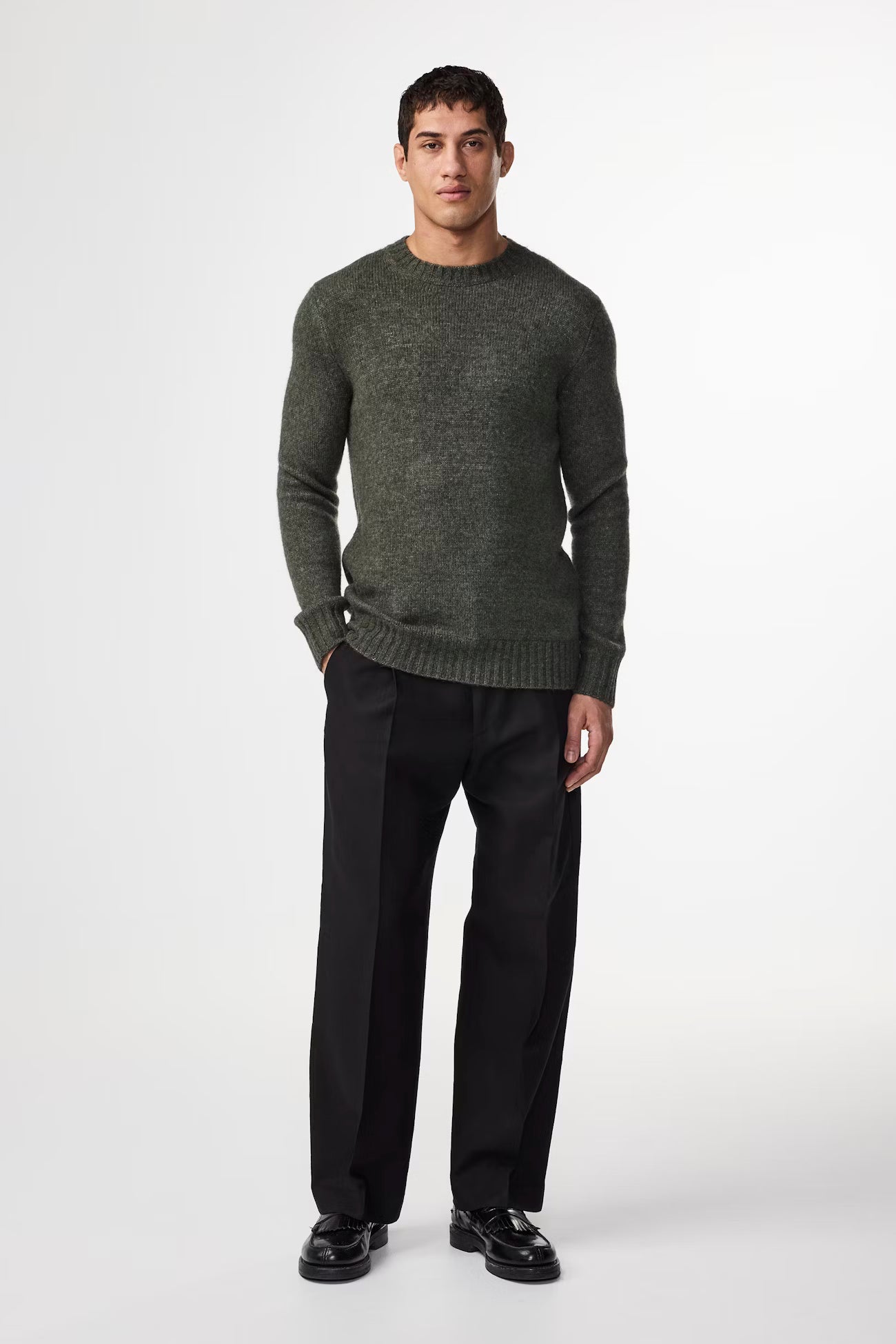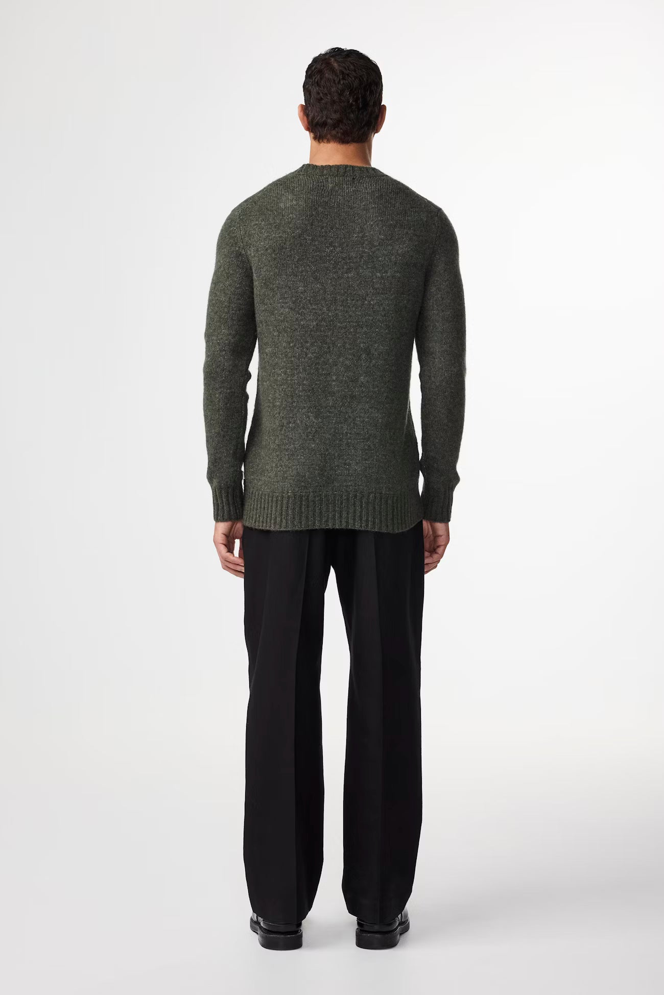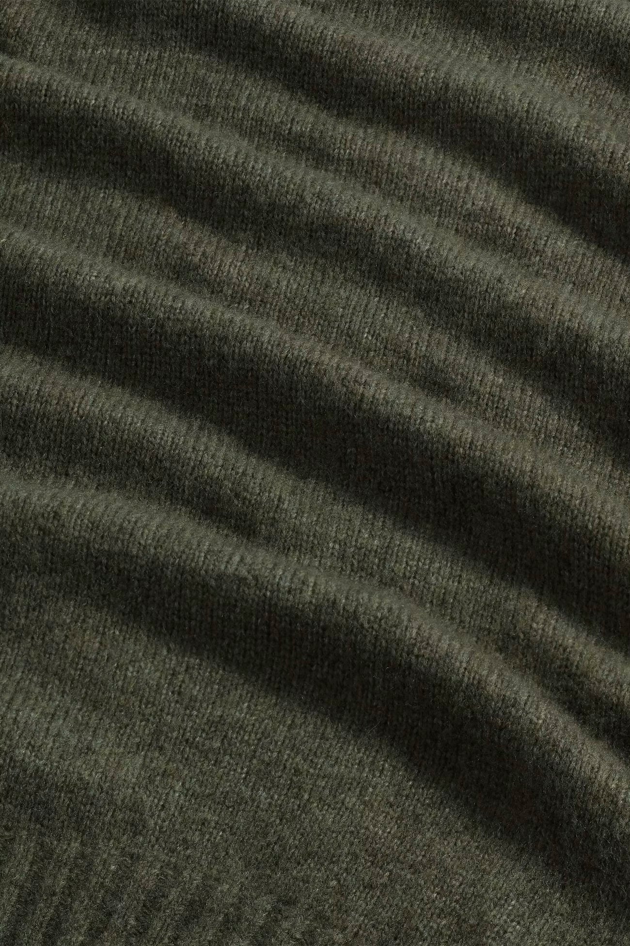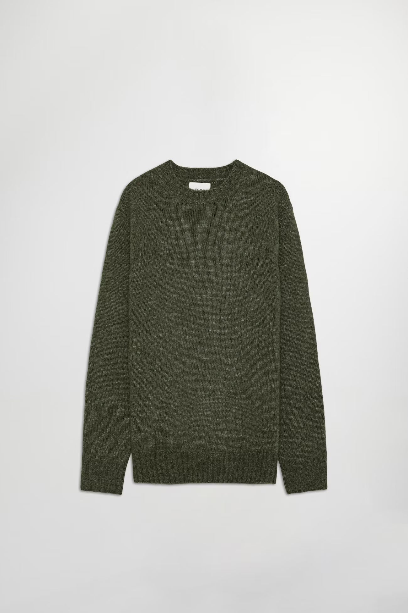 Tröja i ullblandat tyg med axelparti som faller bakåt, diskreta modemärken och bred ribbstickning.