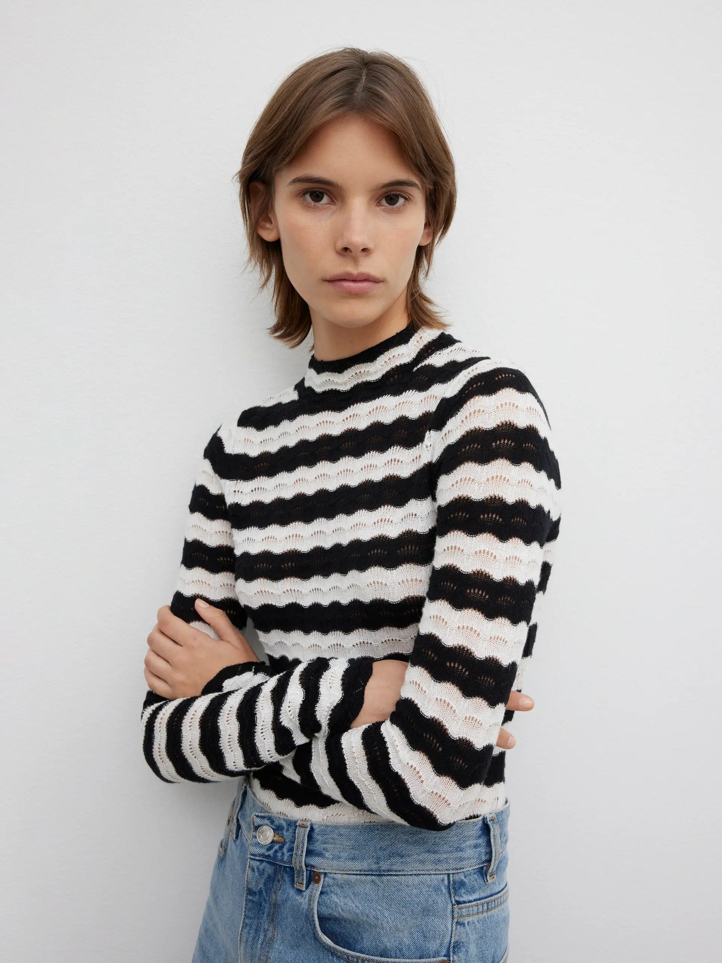 A fine-knit top in featherlight silk blend featuring a close fit, crew neck, and extended sleeves. Lace pattern by Dagmar’s in-house knitting atelier.