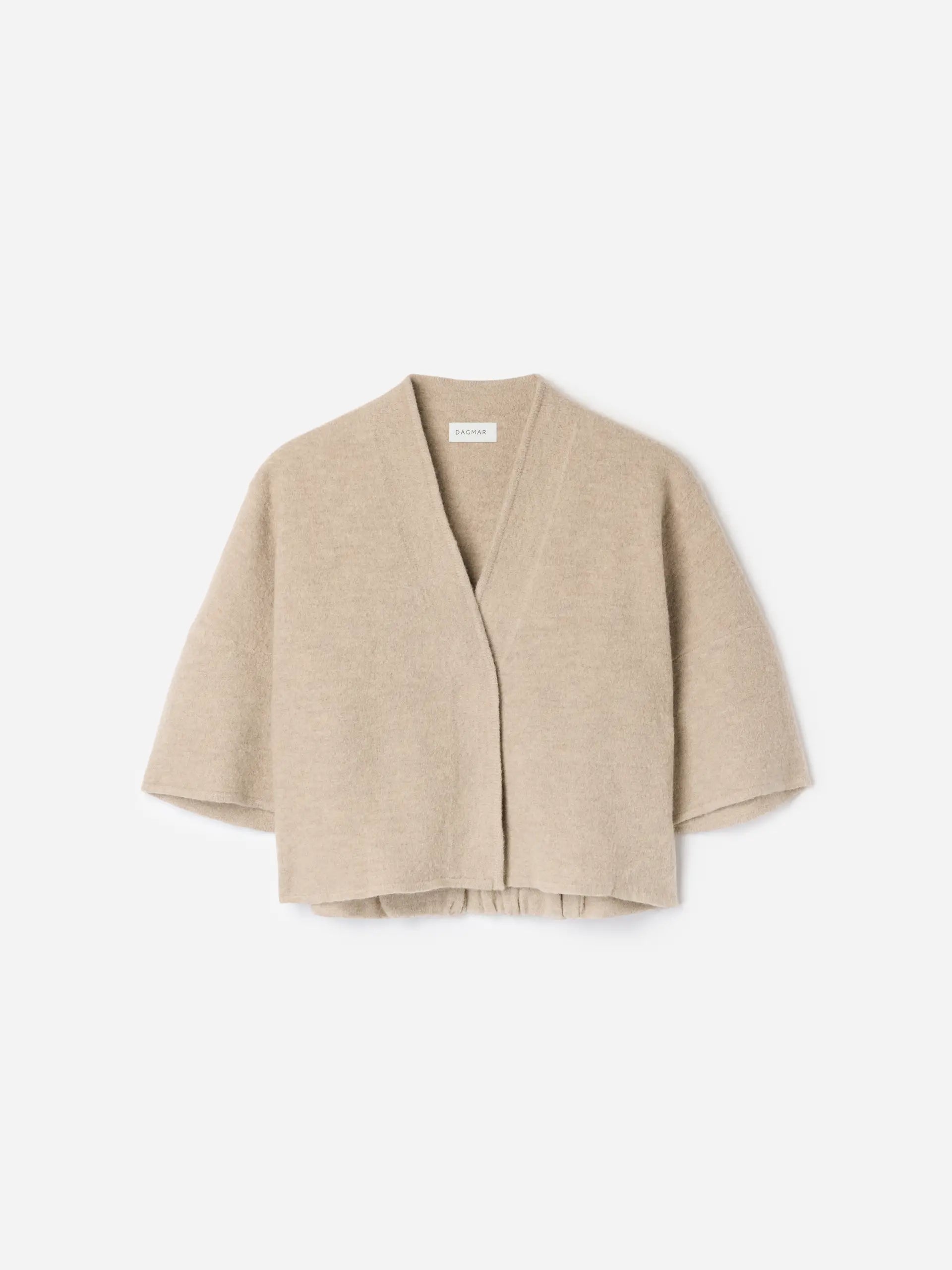 V-neck cardigan in a rich and rigid 100% mulesing-free merino wool. A Dagmar essential presented with a cropped frame, rounded dropped shoulders and concealed buttons at the front.
