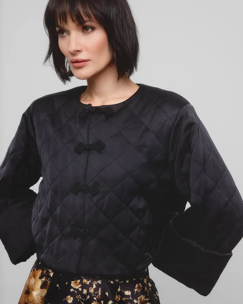 The Tailored Satin Flared Jacket is cut in our structured, shiny and heavy FSC certified fabric. The jacket has a wide, slightly cropped fit, long wide sleeves with cuffs, a round neckline, and closes in the front with decorative hooks. You can combine it with the matching Trousers for an elevated summer look.