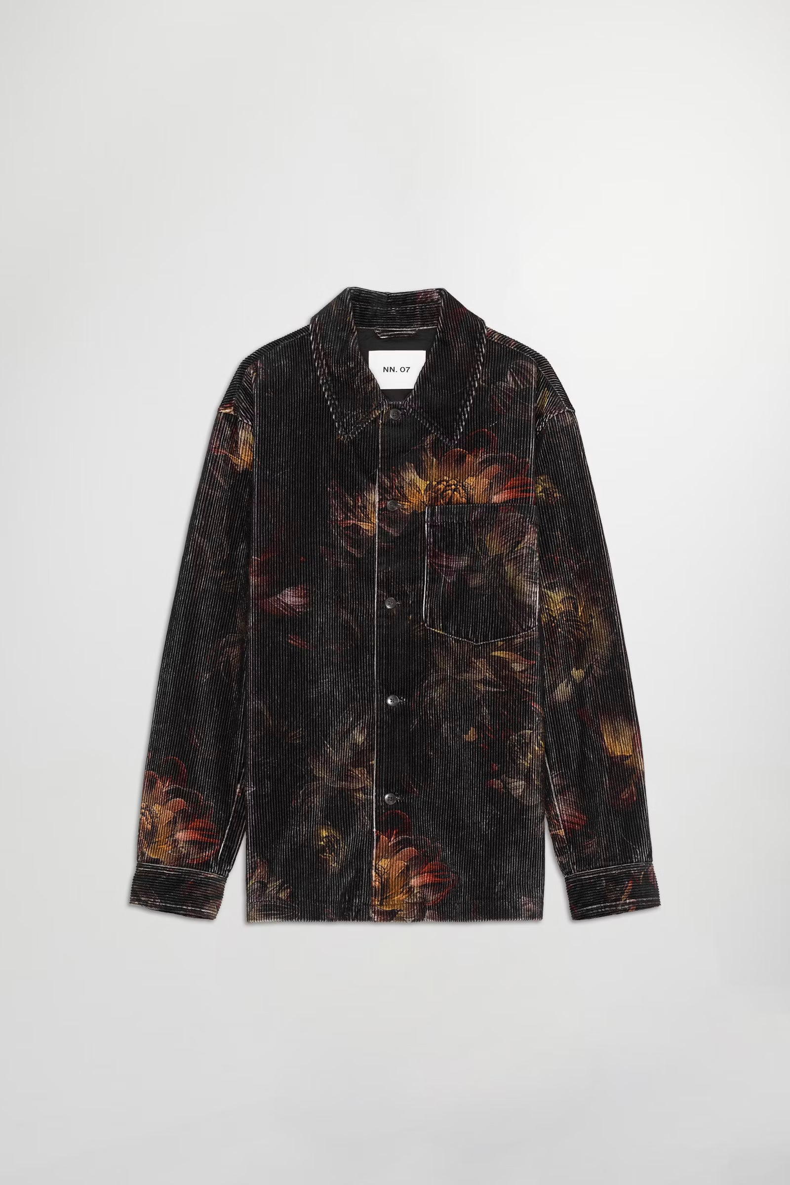 Helfodrad overshirt gjord av tryckt sammetsband i ekologisk bomull med skön stretch. Avslutad med naturligt tonade hornknappar och en bröstficka.