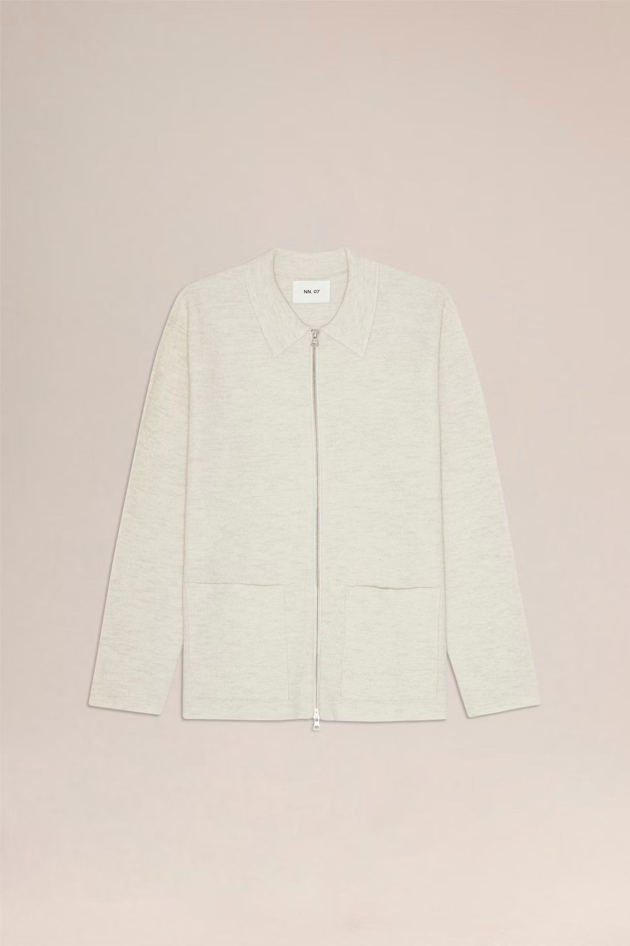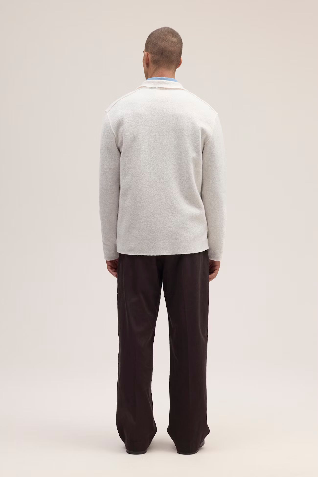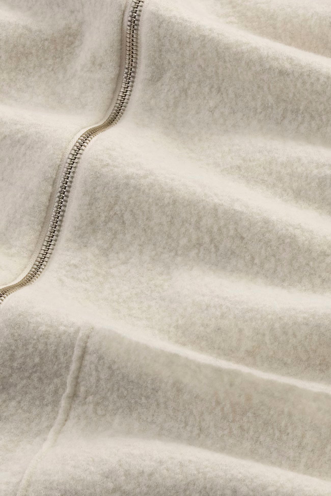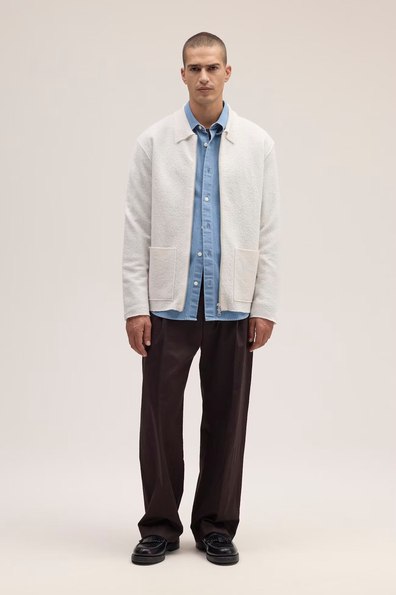 Hybridjacka tillverkad av kokad merinoull med fluffig, texturerad känsla. Designad med råkantade detaljer i kokad ull och helknäppning med dragkedja med logomärke.