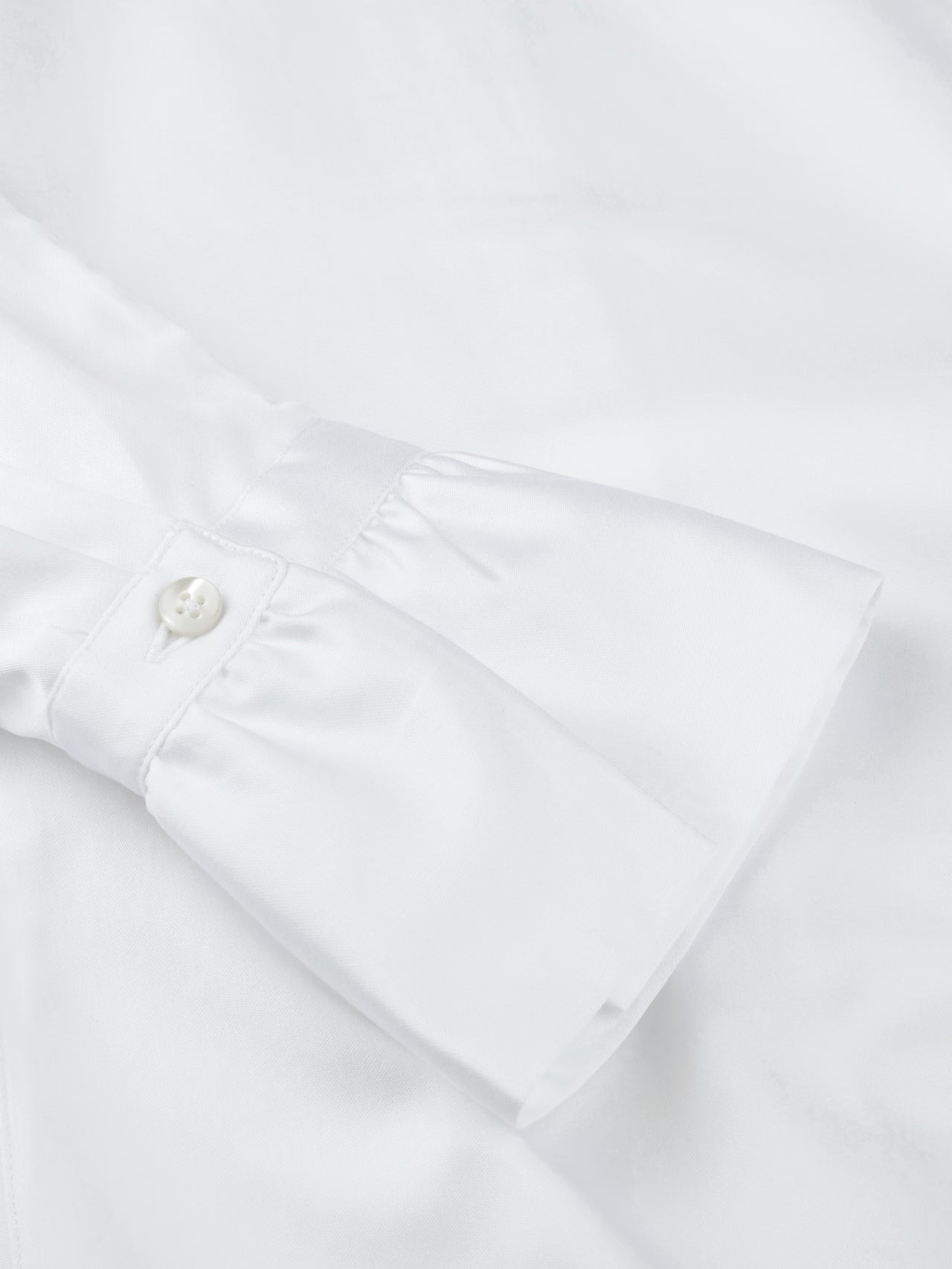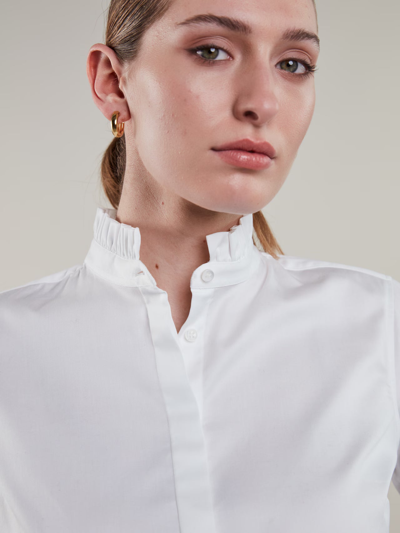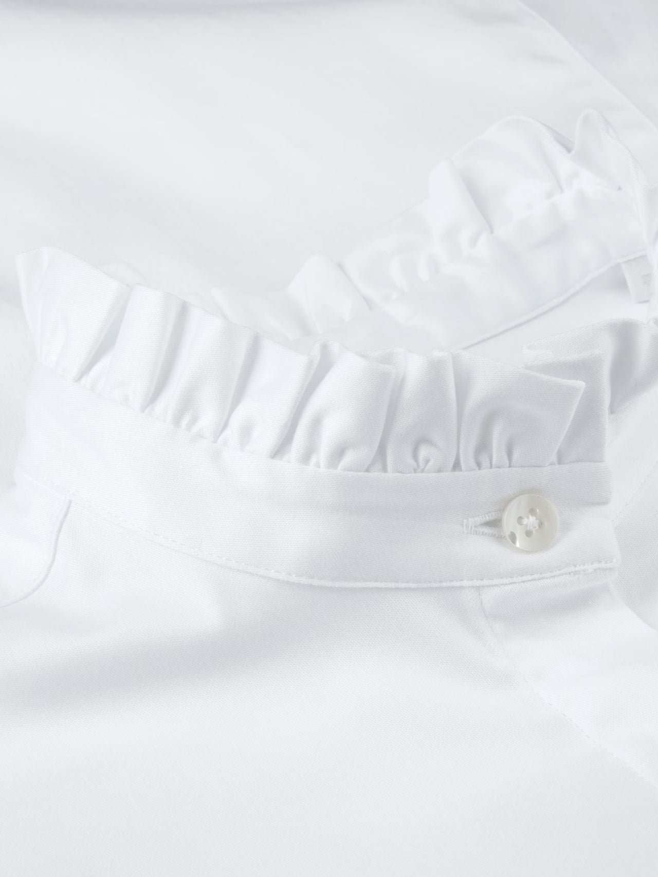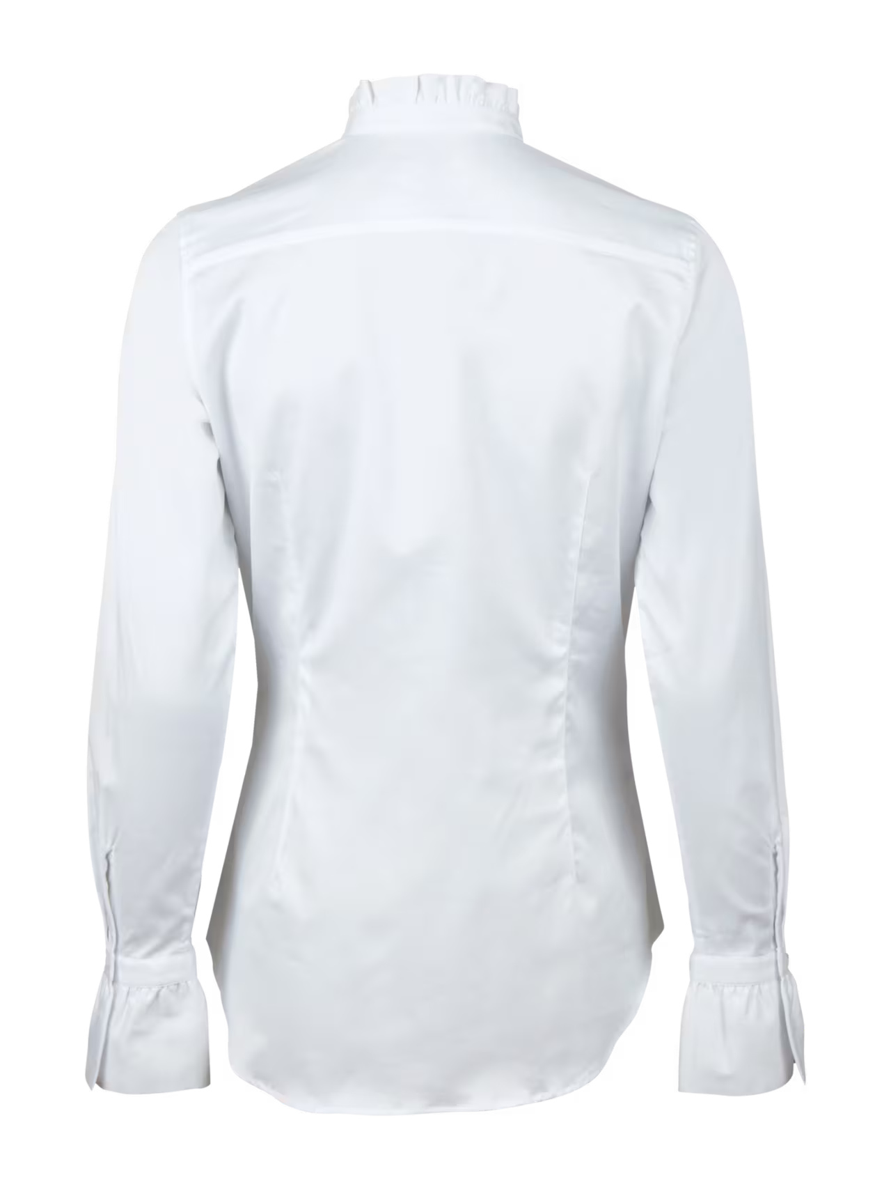 Vit blus med en feminin passform, tillverkad av bomull. Blusen är designad med en dold knappslå, förlängda volang manschetter och en volang krage.