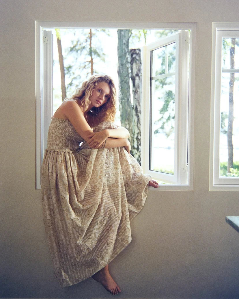 The Checks Bandeau Dress is crafted from our soft and lightweight GRS certified fabric, with embroidery detailing. The dress has a midi length, square neckline, thin shoulder straps and a fitted smocked top. The skirt features gatherings at the waist creating volume and movement.