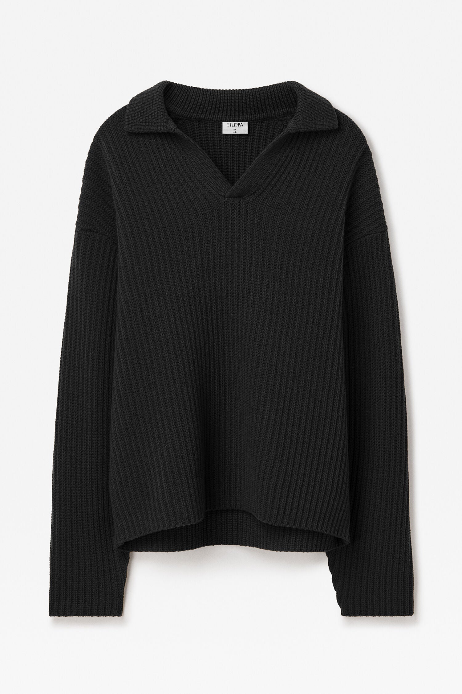 A relaxed polo sweater, knit from heavyweight certified wool with a chunky ribbed texture. Smart and comfortable, it's perfect for a winter dinner party with tailored trousers.
