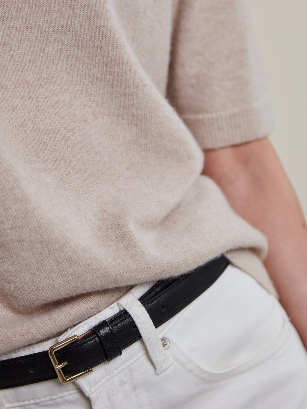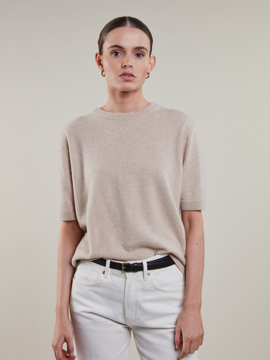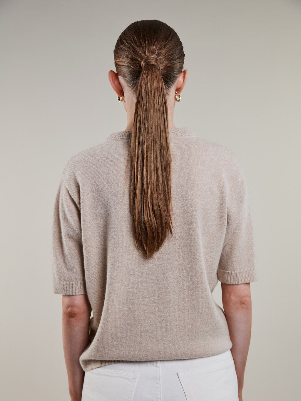 Denna stickade tröja är tillverkad av kashmir och har korta ärmar samt ribbstickade detaljer vid krage, ärm- och plaggslut.