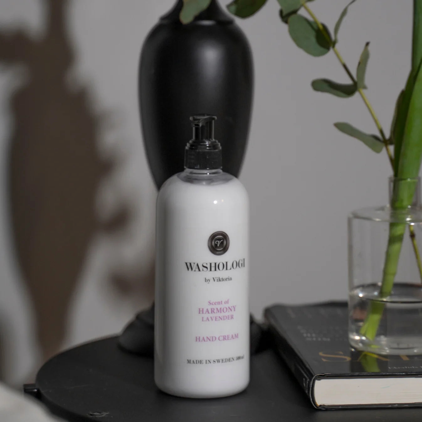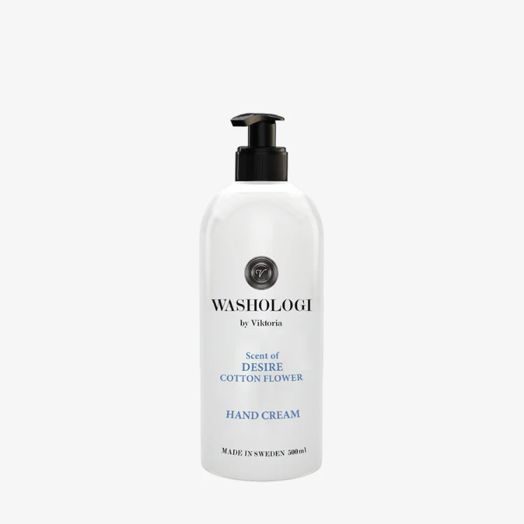 WASHOLOGIs Hand Cream finns i två ljuva dofter, Desire & Harmony. Handkrämen blir inte kladdig och innehåller vårdande aloe vera som återfuktar för att motverka och förebygga torra händer. Flaskan är tillverkad av bioplast. Handkrämen är biologiskt nedbrytbar och fri från färgämnen.