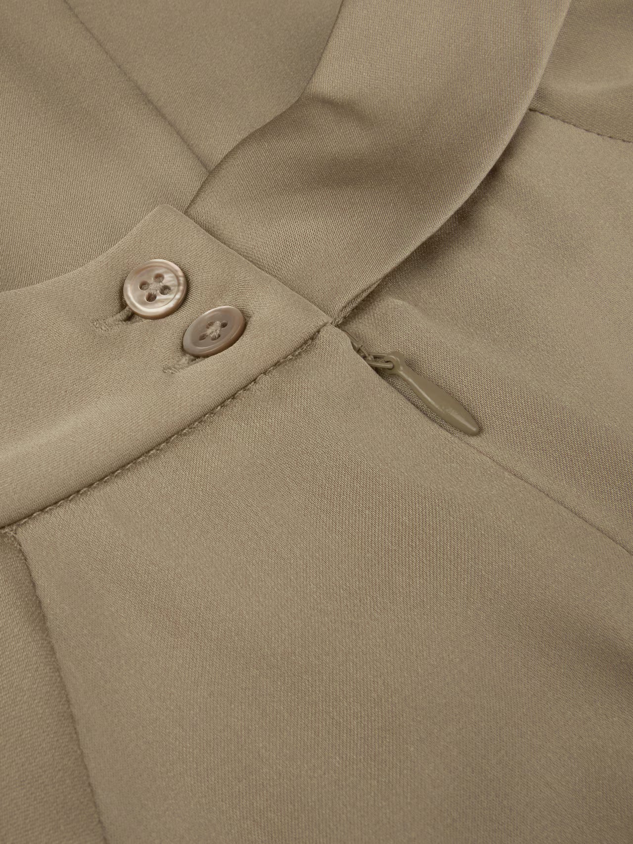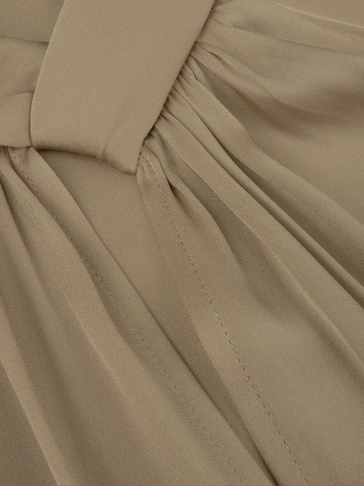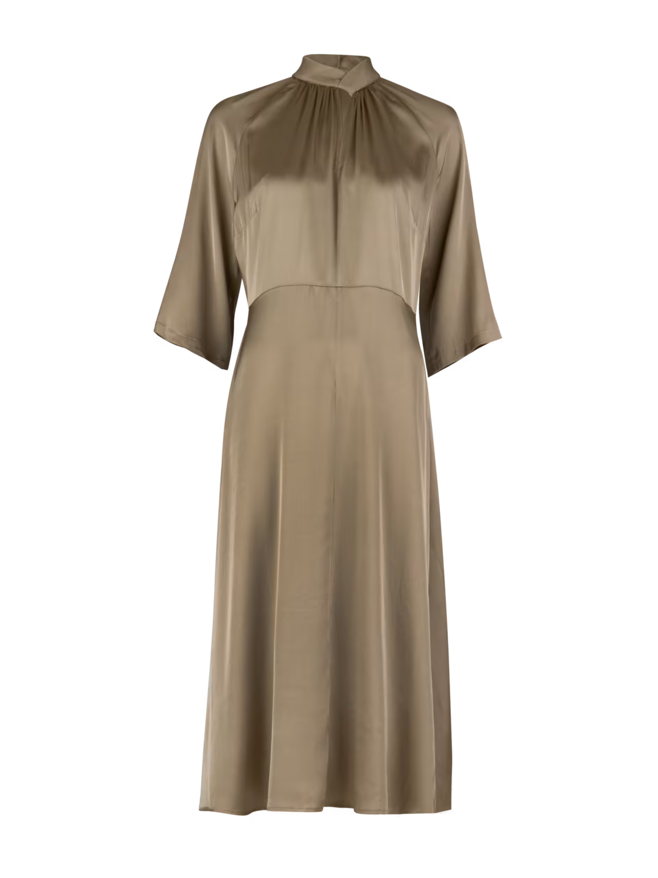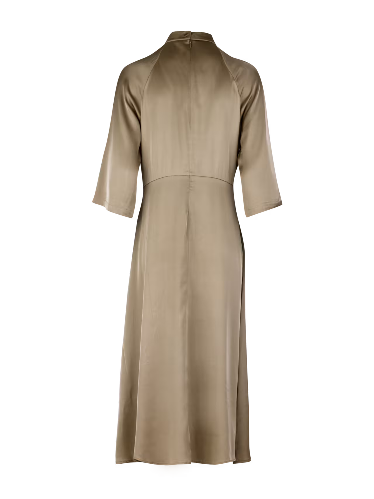 Denna klänning är tillverkad av siden och viskos och har en feminin passform. Klänningen har en twistad krage, vid kjol och 3/4 ärmar.