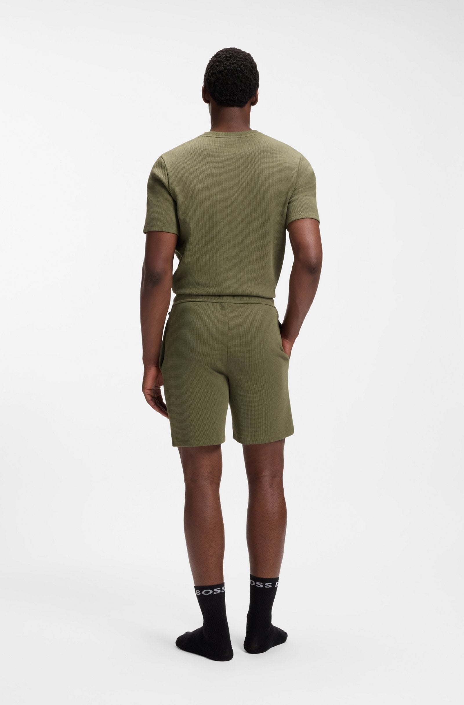 Pyjamasshorts från BOSS Herr. Tillverkade i en våfflad bomullsblandning med raka byxben, perfekt för avkoppling. Diskret broderad logga.