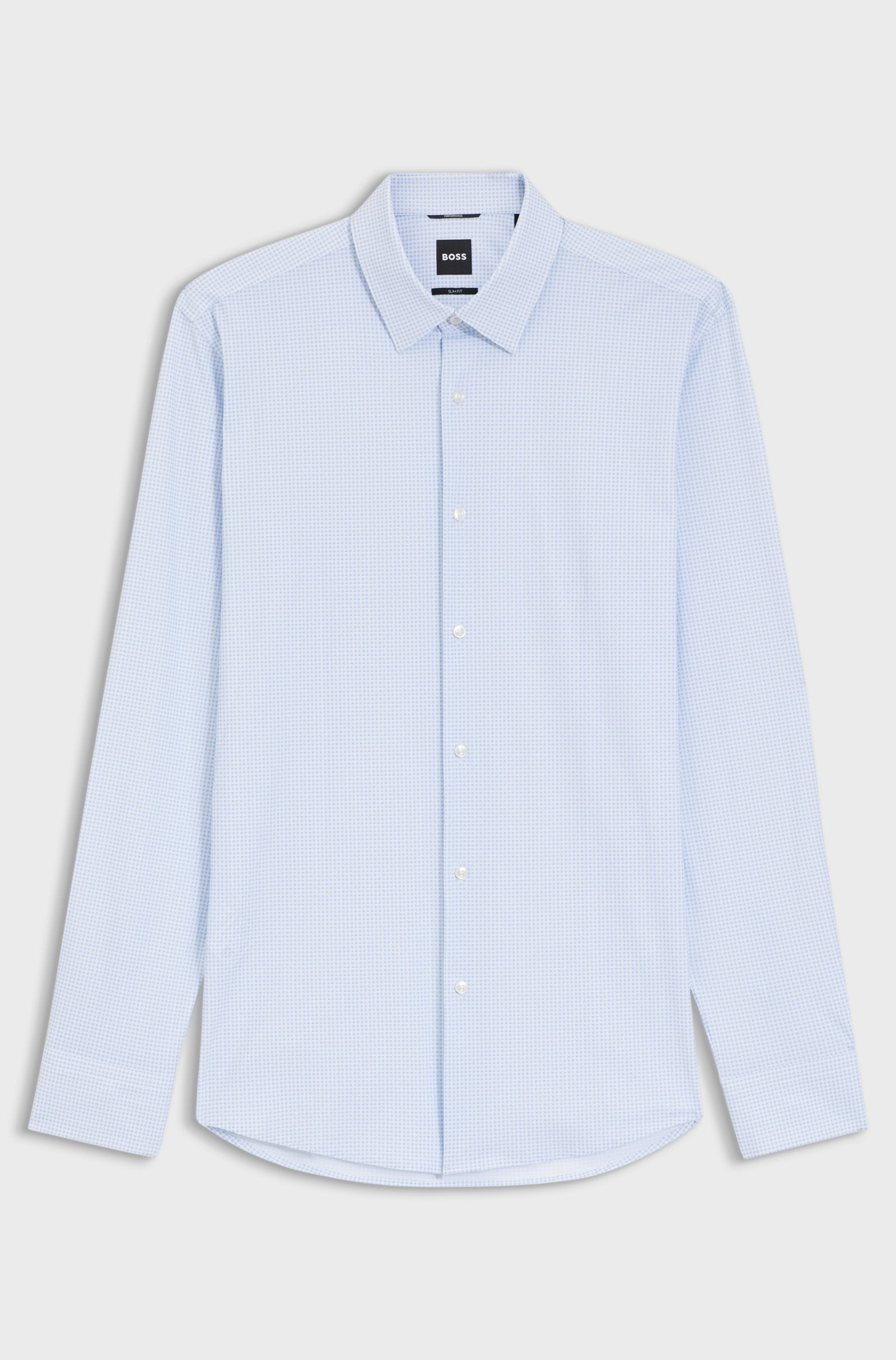 Uppdatera din businessgarderob med den här skjortan från BOSS Herr. Med modernt tryck och den superflexibel jersey. Skräddad slim fit.