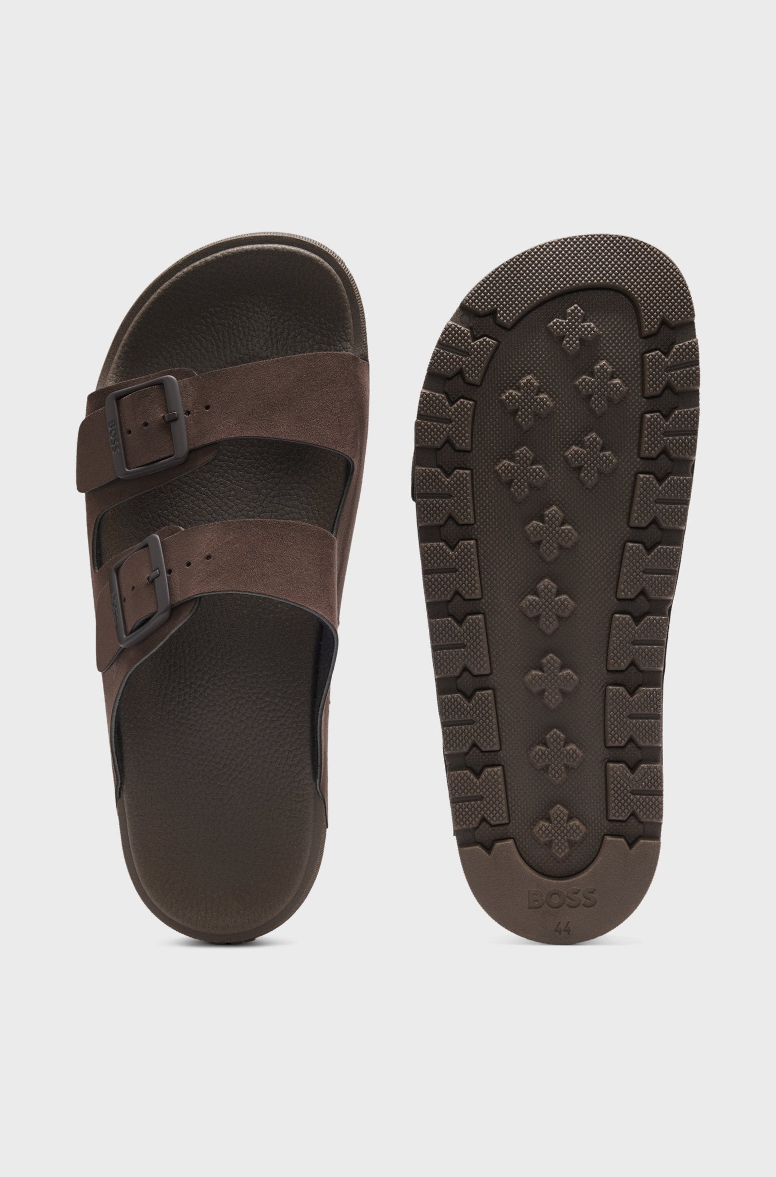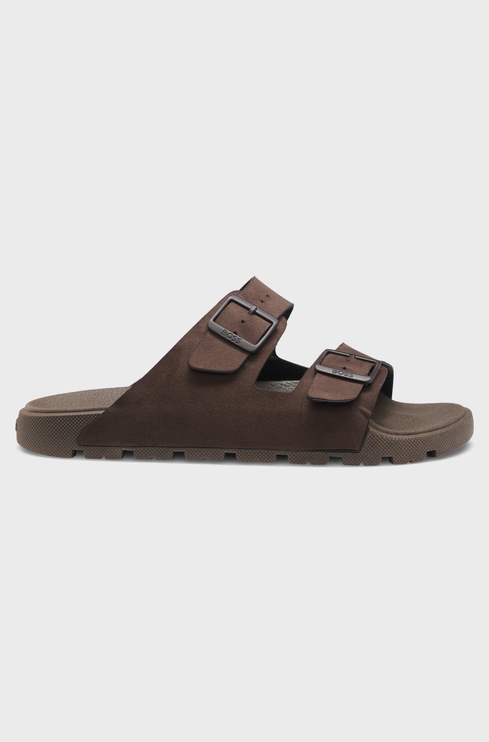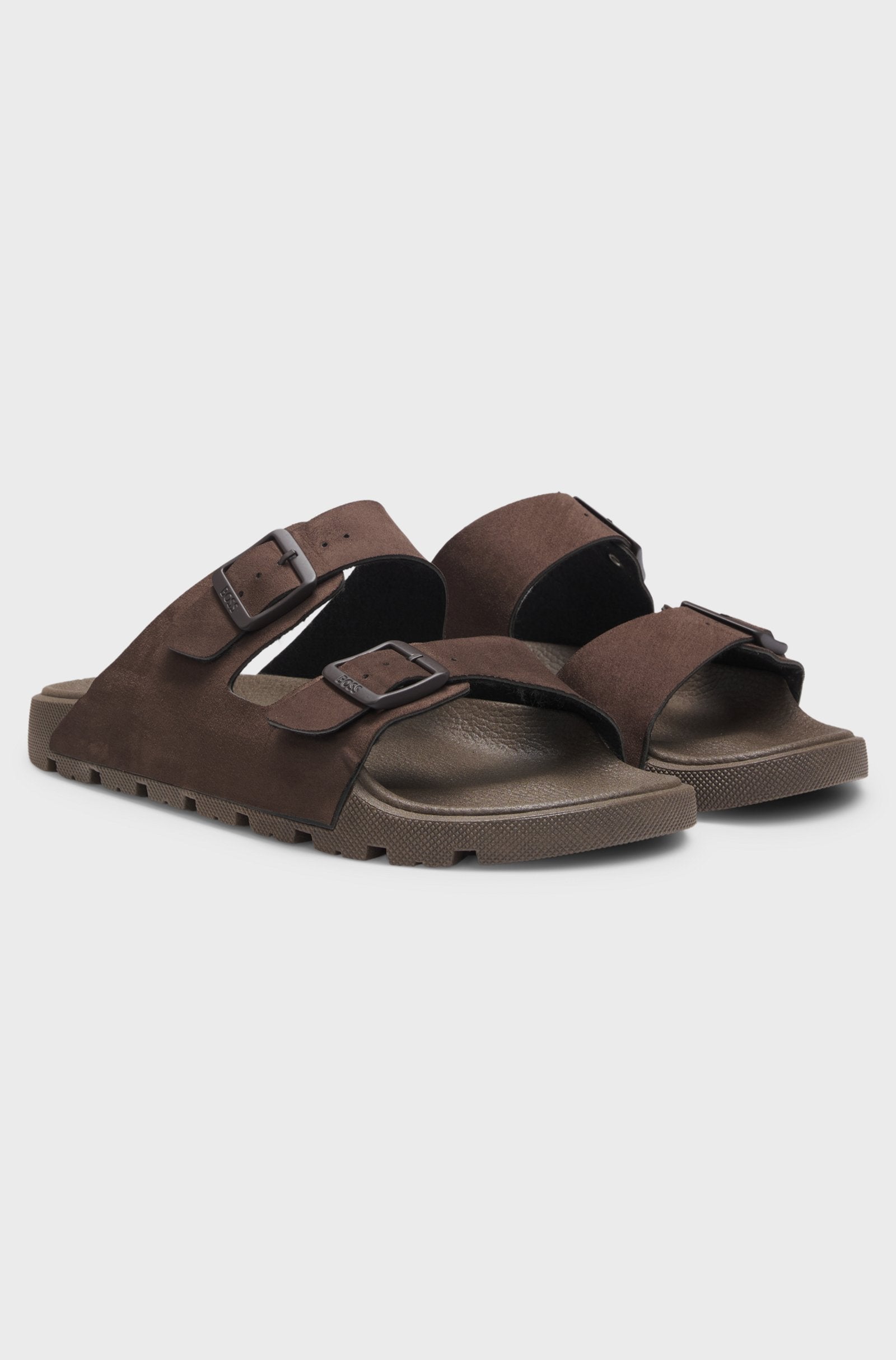 Tofflor från BOSS Herr. Med en formad fotbädd för komfort och klassisk ovandel med dubbla remmar i mockaimitation. Spännena går ton-i-ton och har en logga.