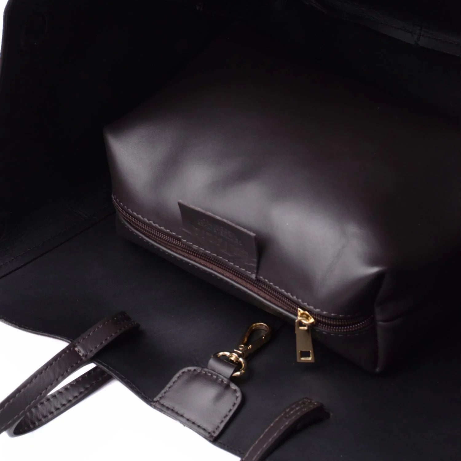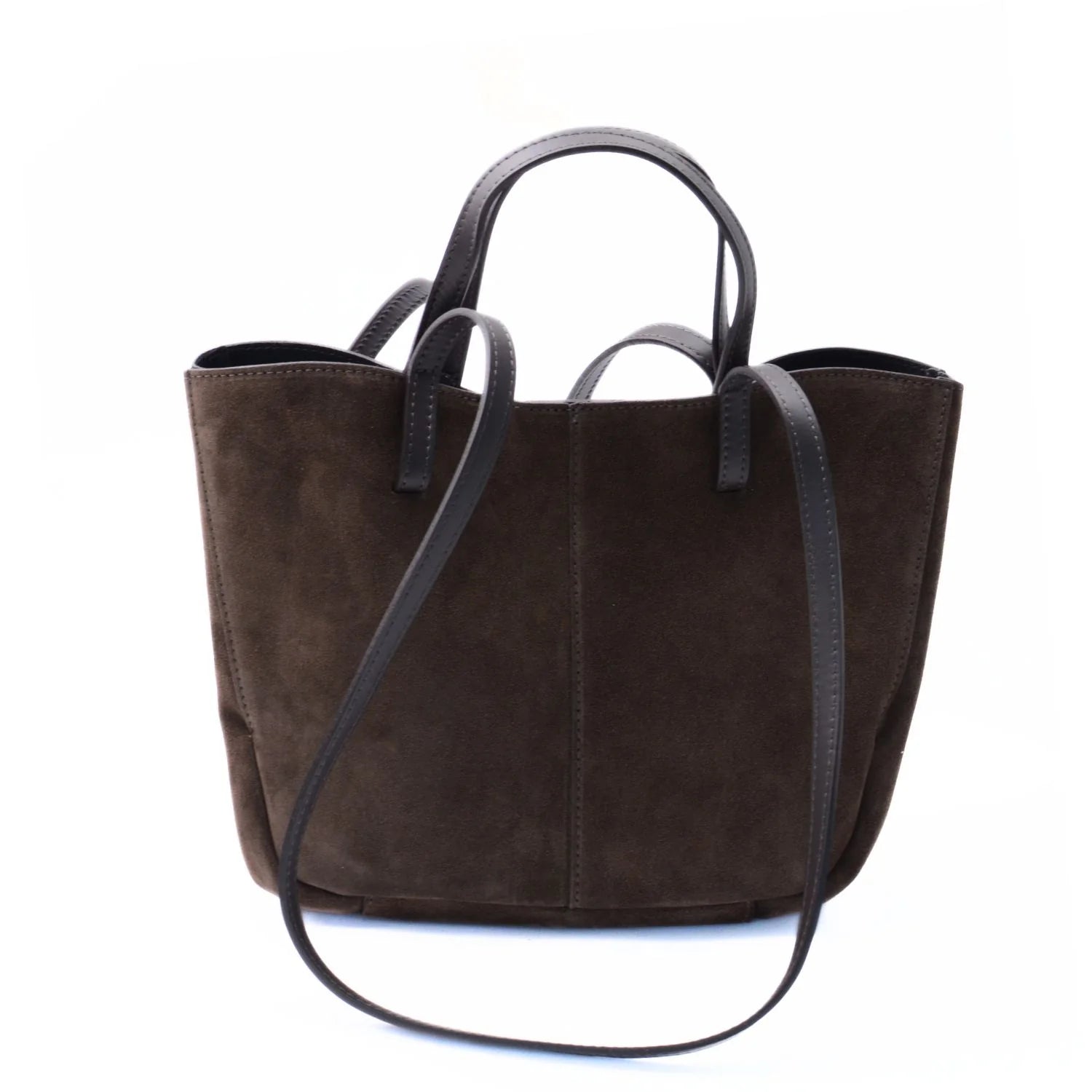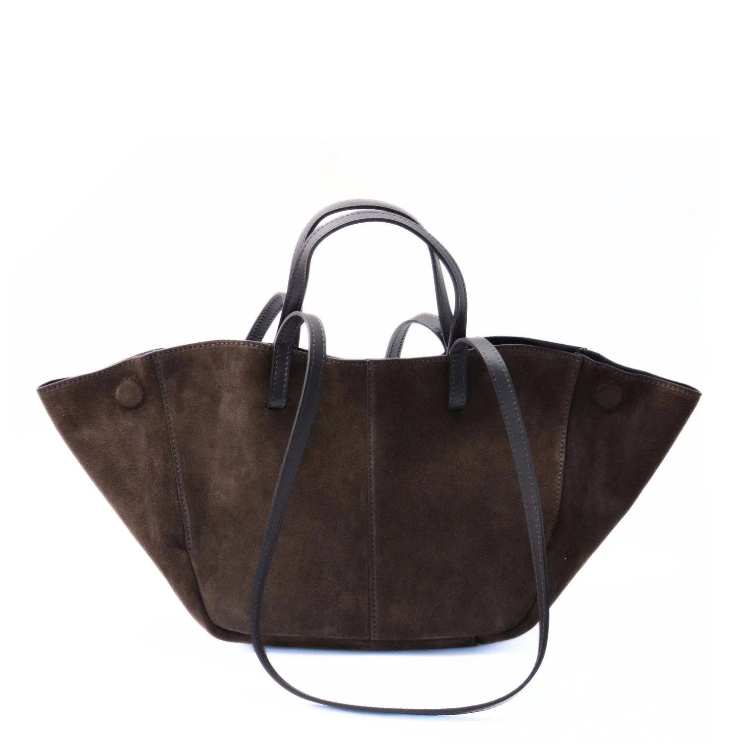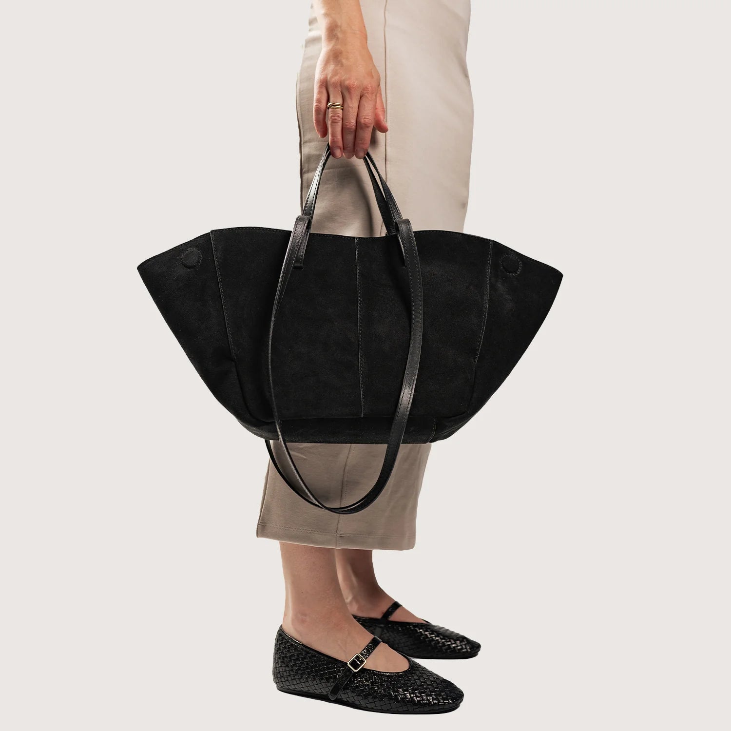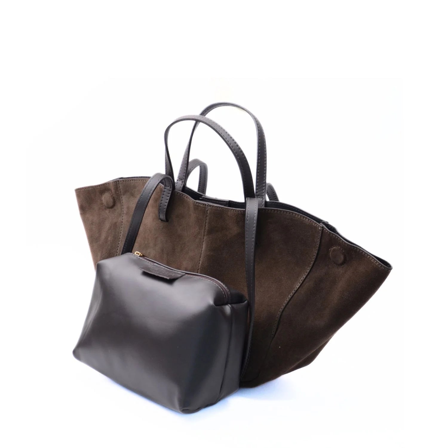 Nola är en rymlig och mjuk väska i mocka som utan problem rymmer en MacBook Pro. Tack vare magnetknappar i sidorna kan väskan enkelt göras mindre och anpassas efter behov. Utrustad med två handtag och två längre axelremmar för flexibel bärkomfort. På insidan finns en separat liten necessär i äkta läder som håller ordning på dina mindre saker. En elegant och praktisk väska för både jobb och vardag.