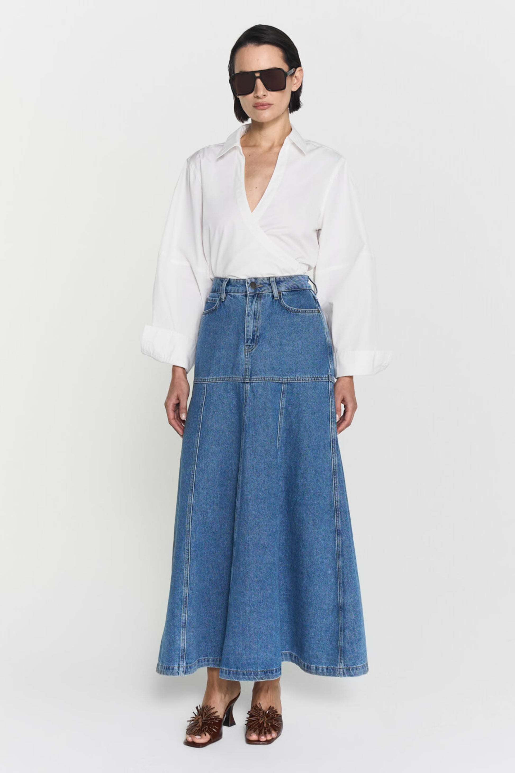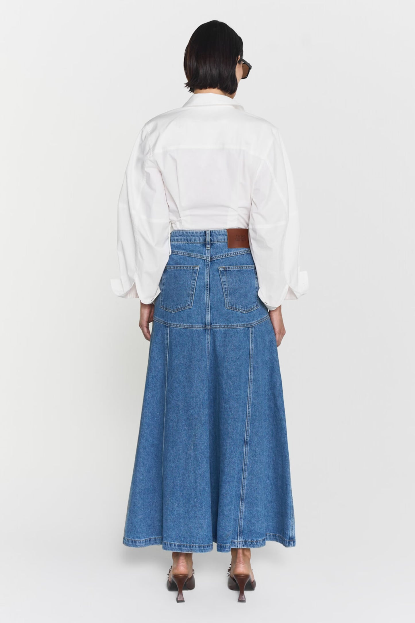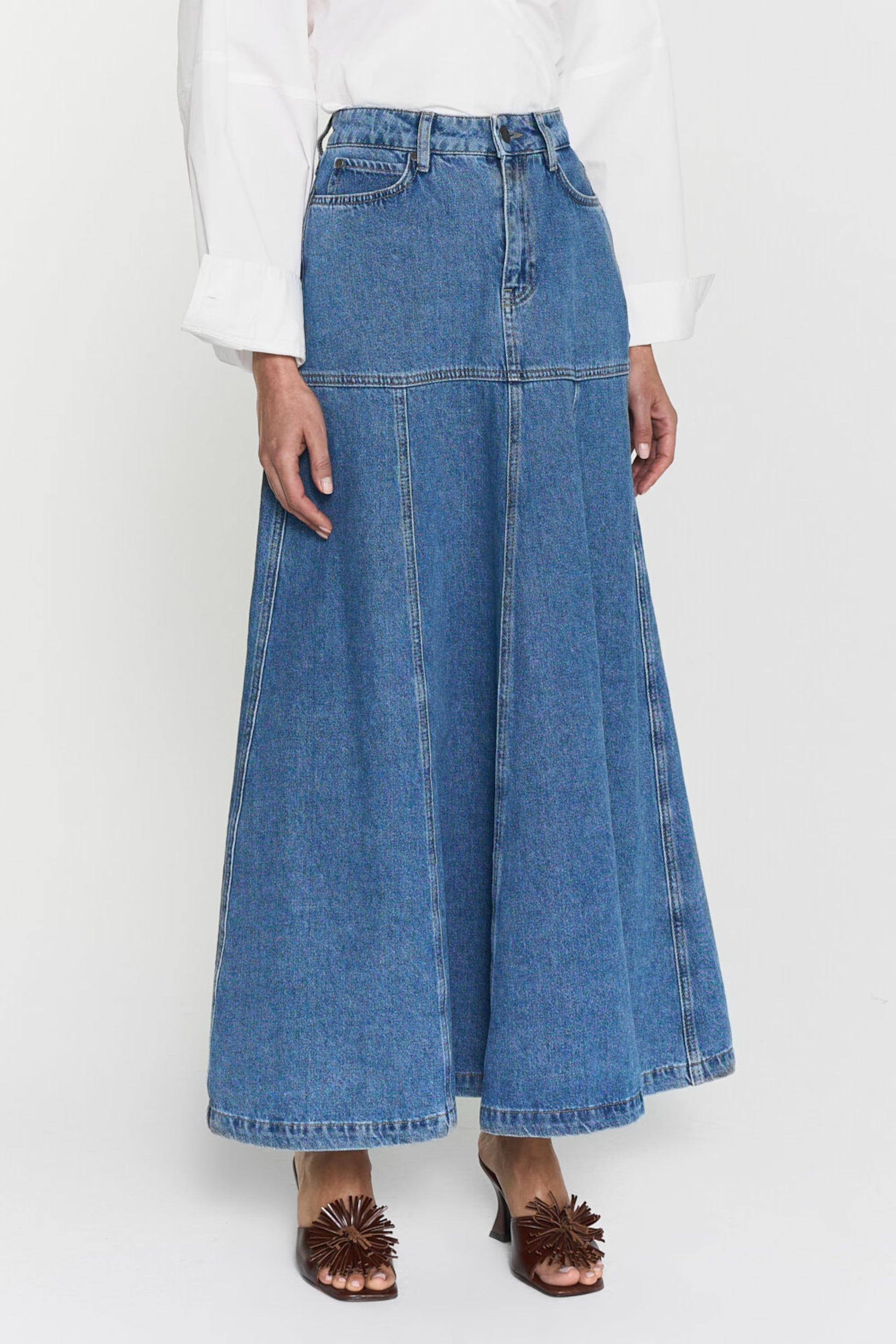 Step into style with the Sherry Denim Skirt. Crafted from 100% cotton, it boasts a flattering high waist, 5 pockets, and a circle skirt with panels, delivering a chic long-length silhouette.