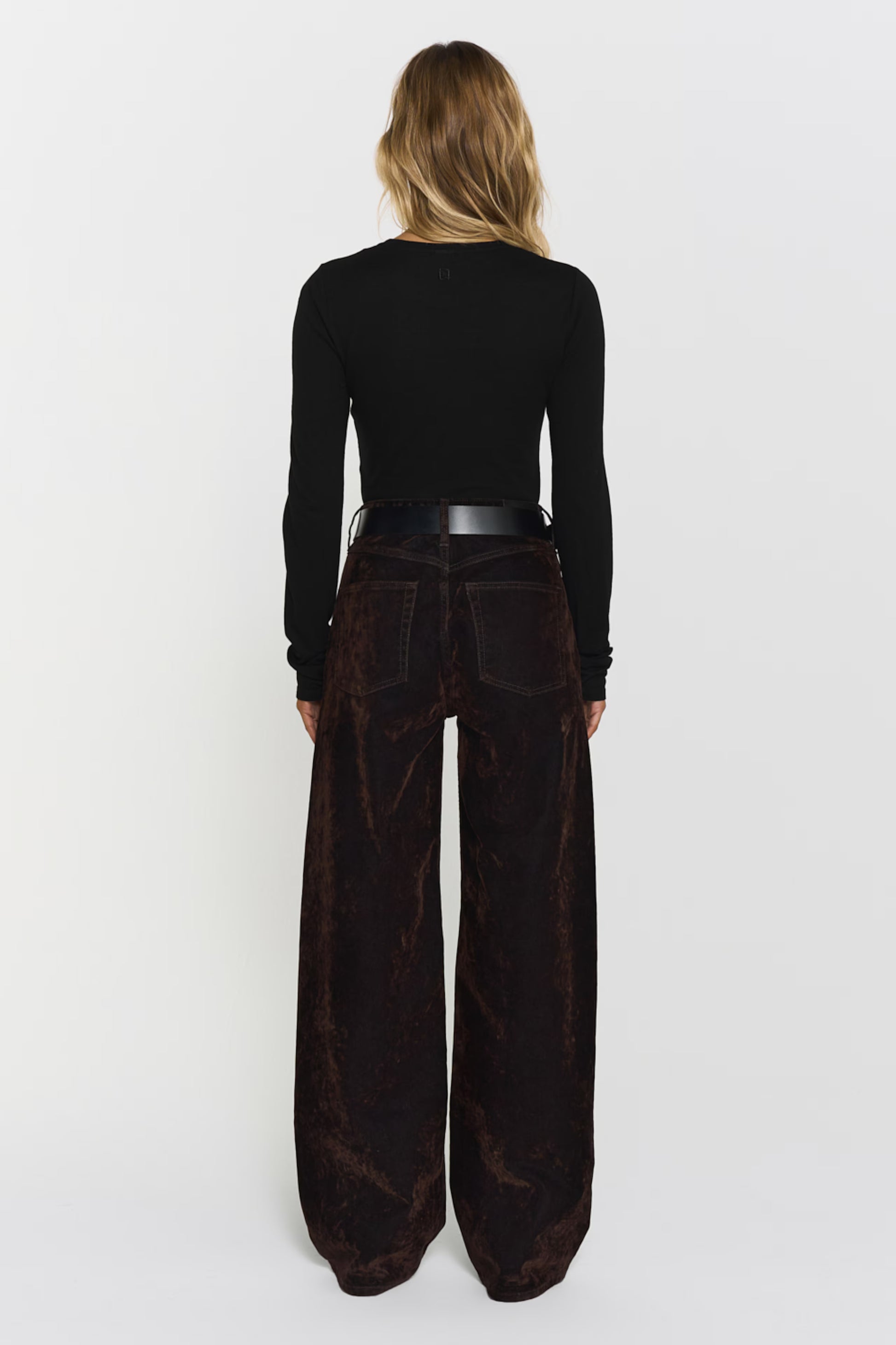 The model is 171 cm tall and is wearing size XS/34. The Turid Flocked Denim Jeans feature a high-waisted, wide-leg silhouette crafted from 100% cotton. A flocked finish adds a unique mocha-toned texture to the denim. Designed with five pockets, button and zip closure.