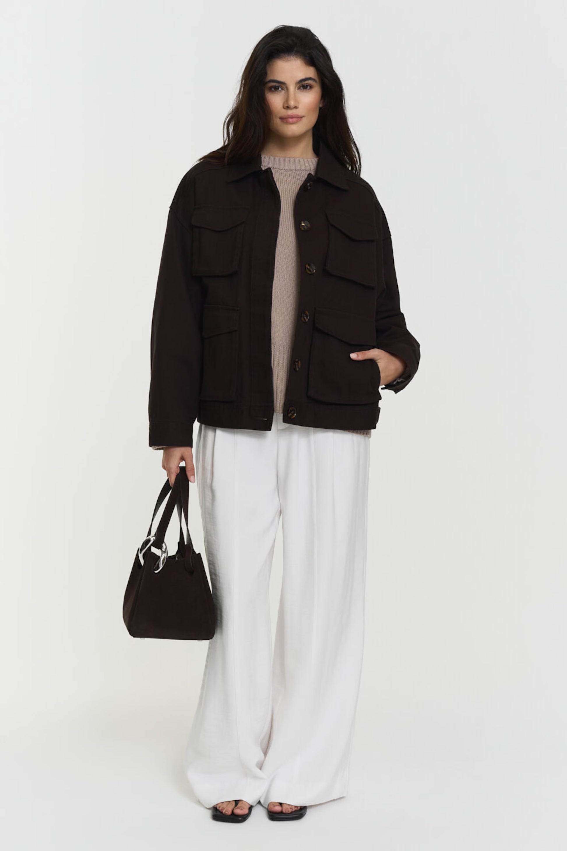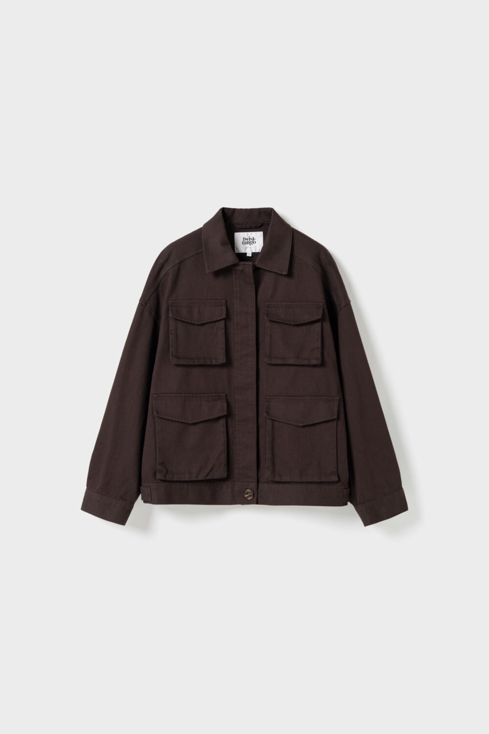 The Zelda Jacket, expertly crafted from hard-wearing cotton-twill. It has an oversized fit, big patch pockets, adjustable flaps in sides, and a classic cuff at the sleeve end.