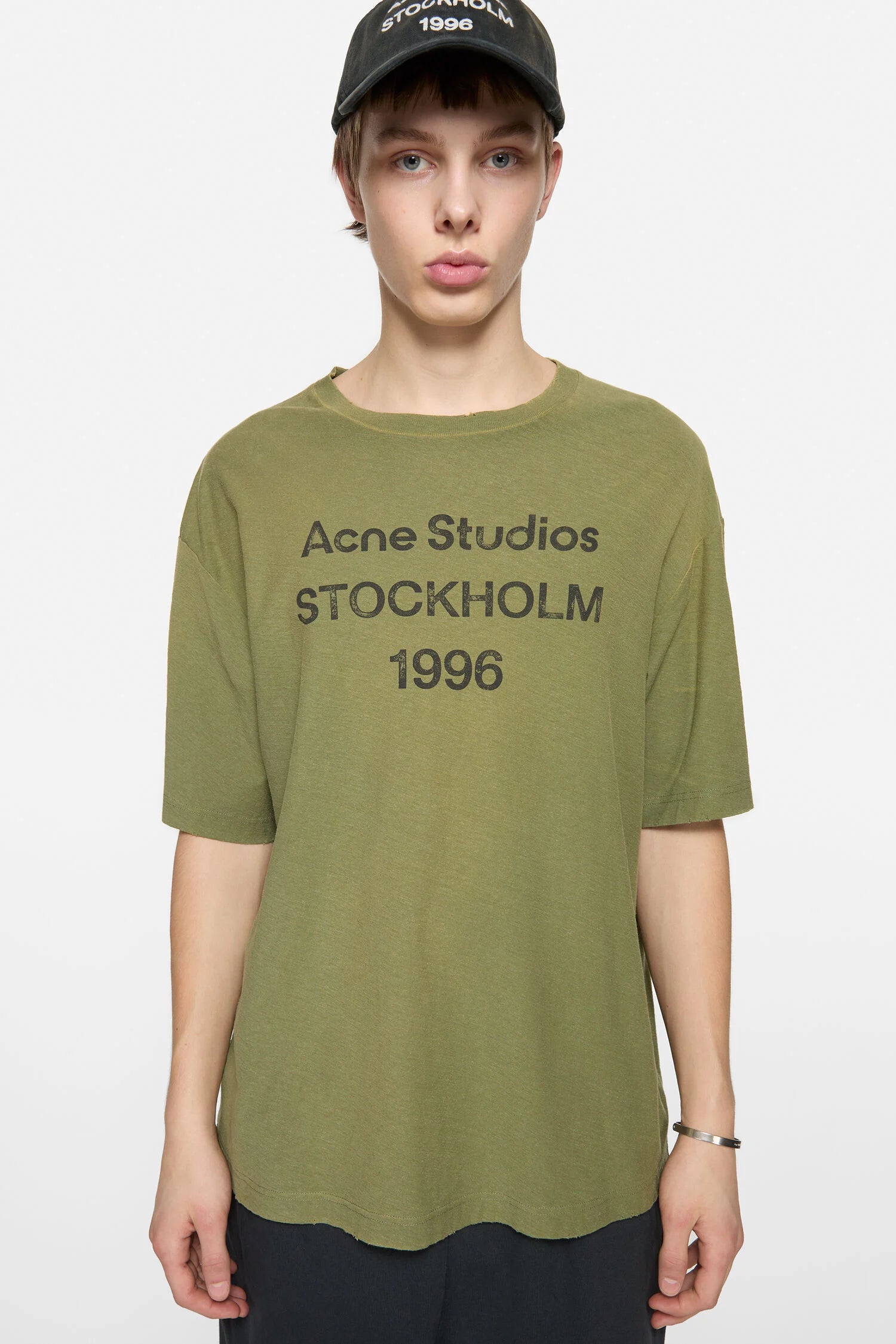 Crew neck t-shirt is cut to a relaxed unisex fit. Detailed with an Acne Studios 1996 stamp logo, distressed neckline, cuffs and bottom hem. Crafted from cotton with a sprayed vintage finish.
