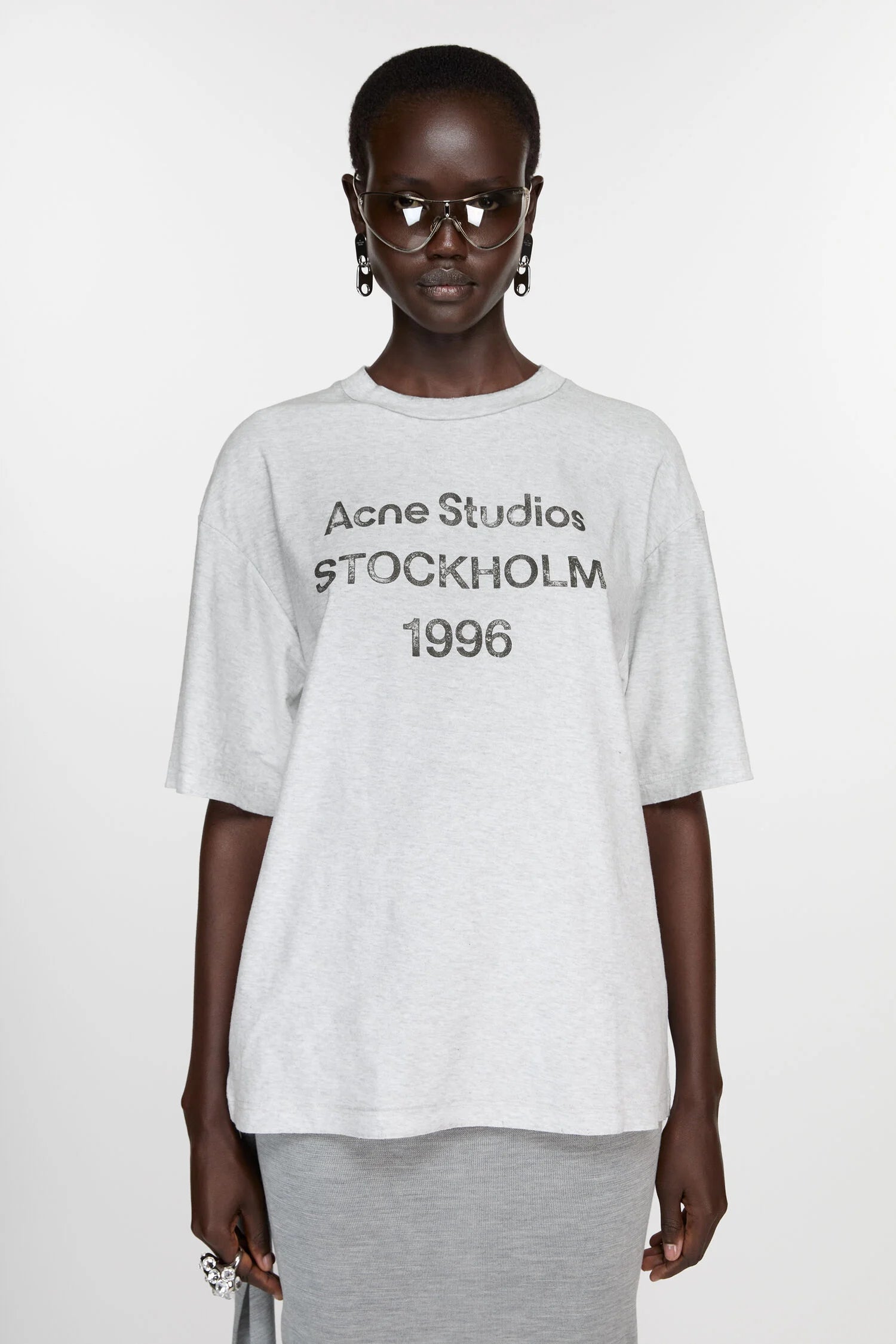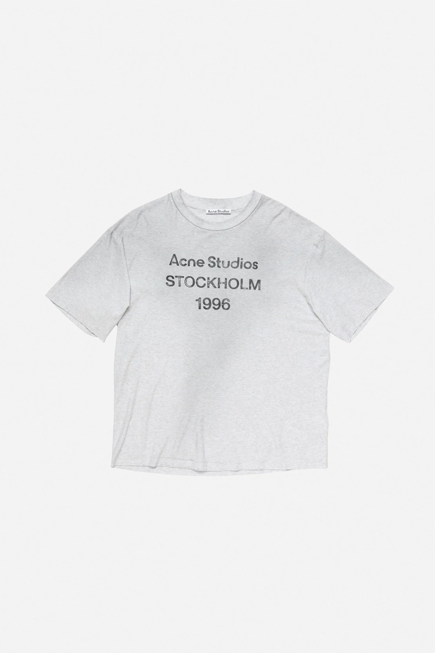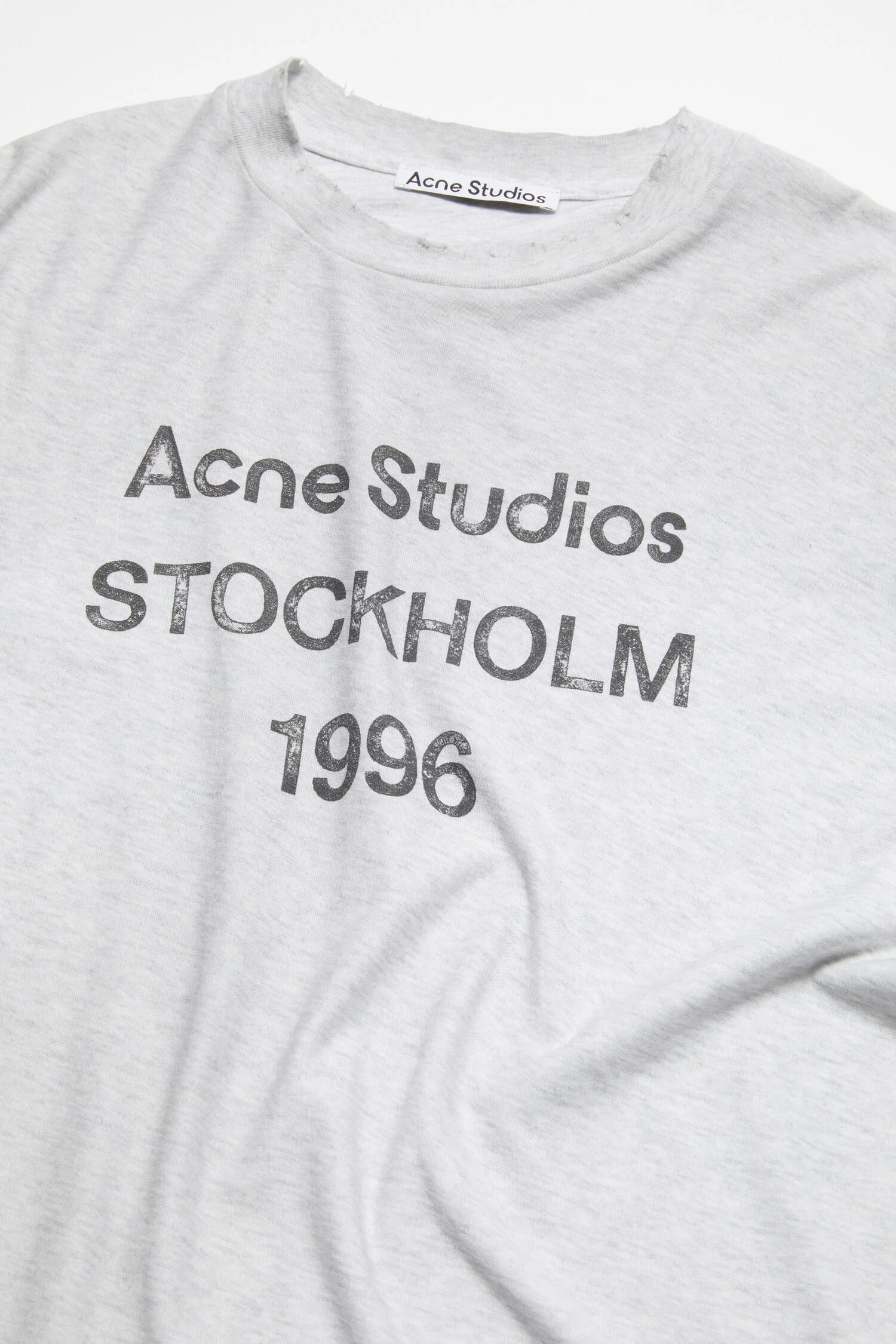 Crew neck t-shirt is cut to a relaxed unisex fit and hip length. Detailed with an Acne Studios 1996 stamp logo, distressed neckline, cuffs and hem. Crafted from cotton with a sprayed finish.