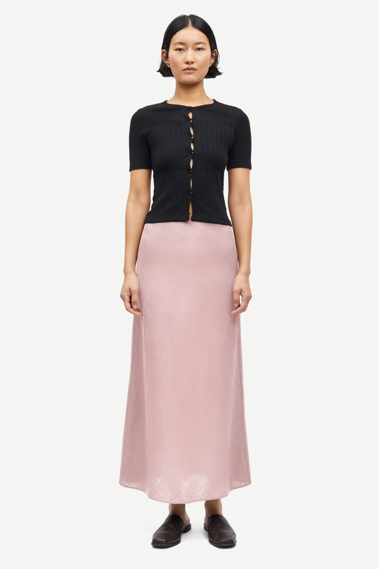 Mid-waist maxi skirt with a slim fit. Invisible zipper and hook closure. Elastic waistband. Main material made from 100% linen.