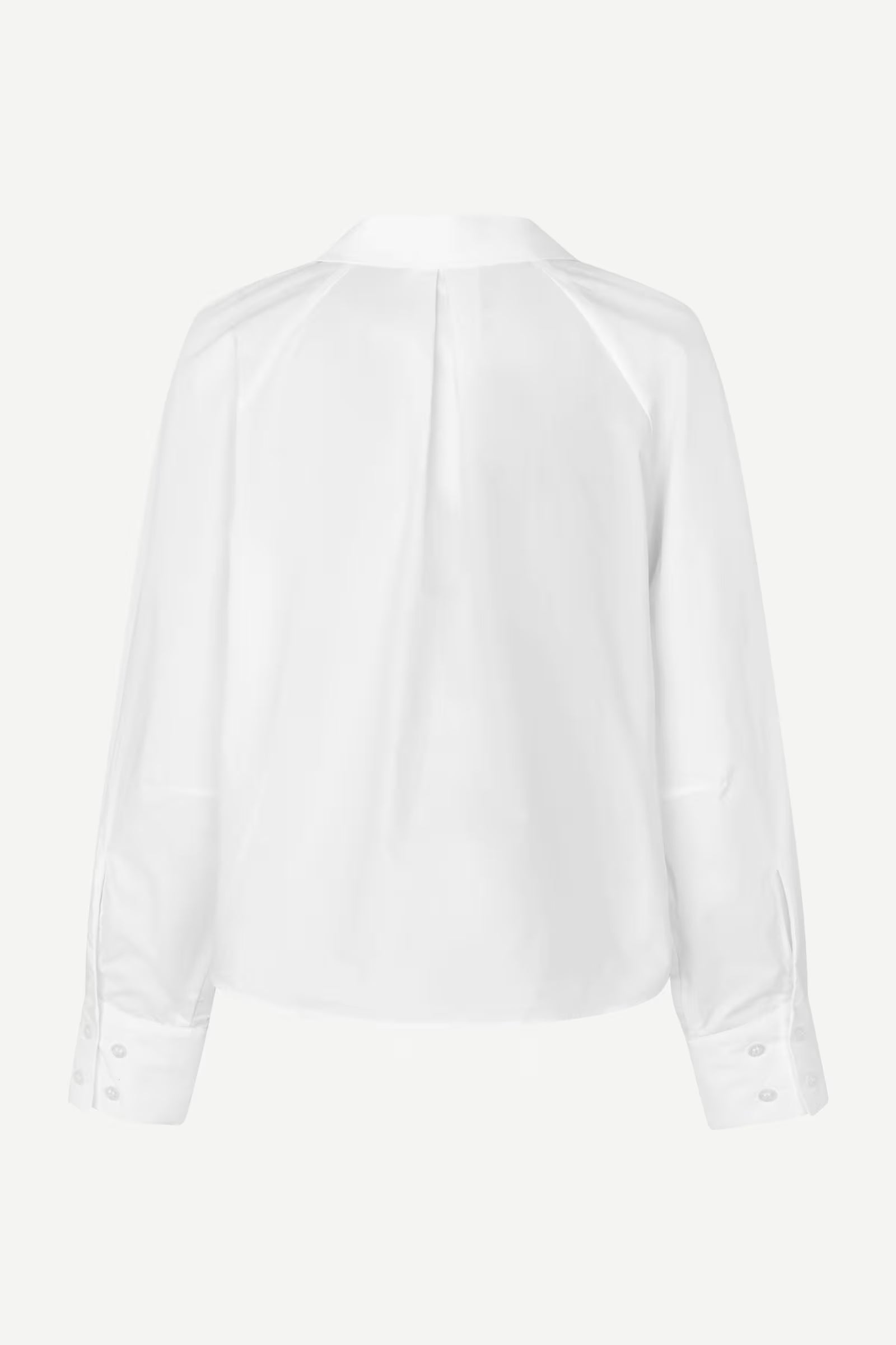 Long-sleeved shirt with a loose fit and curved sleeves. Button closure on the front and buttoned cuffs. Rounded hem. Draped detailing below the collar. Neck yoke seam. Main material made from 100% organic cotton.