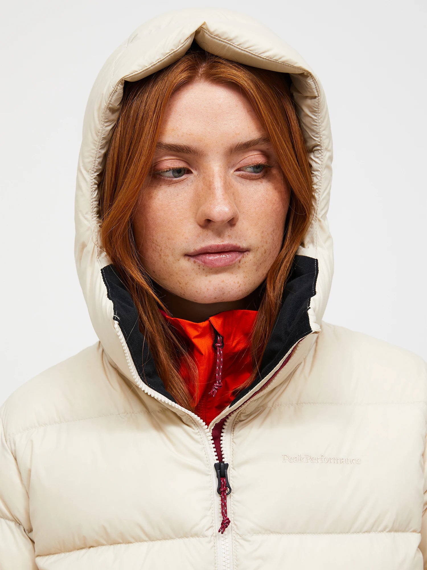 Vår Frostkollektion har varit en storsäljare i över tio år. Den här dunjackan med huva har en modern puffer-silhuett som kombinerar värme och mjukhet med en packbar konstruktion. Tillverkad av lätt, återvunnen polyamid och fylld med högkvalitativ vaddering av 90/10-ankdun/fjädrar för exceptionell värme. En mångsidig jacka, både när det gäller funktion och stil.