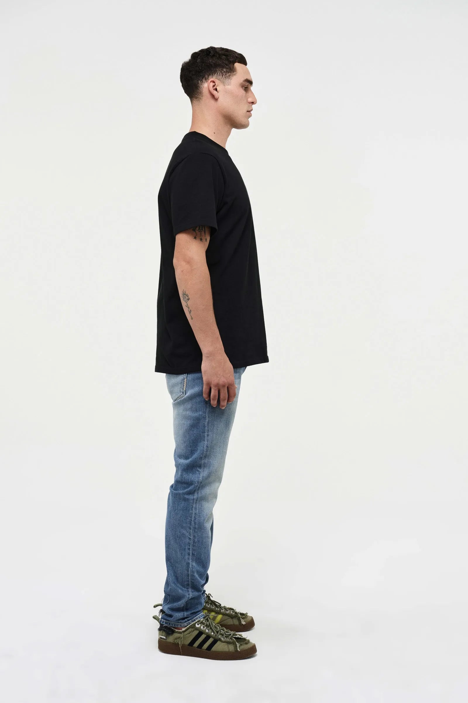 An irregular fit with a lean straight leg. Wear true to size for a modern straight style look or size down for a slimmer silhouette.