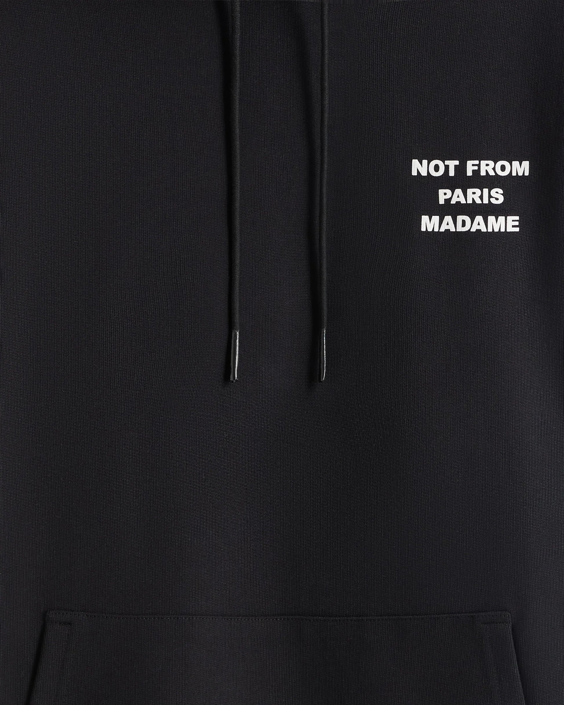 This black 100% cotton French terry hoodie with ribbed hem and cuffs is printed with the 'Not From Paris Madame' slogan on the front and embroidered on the back.