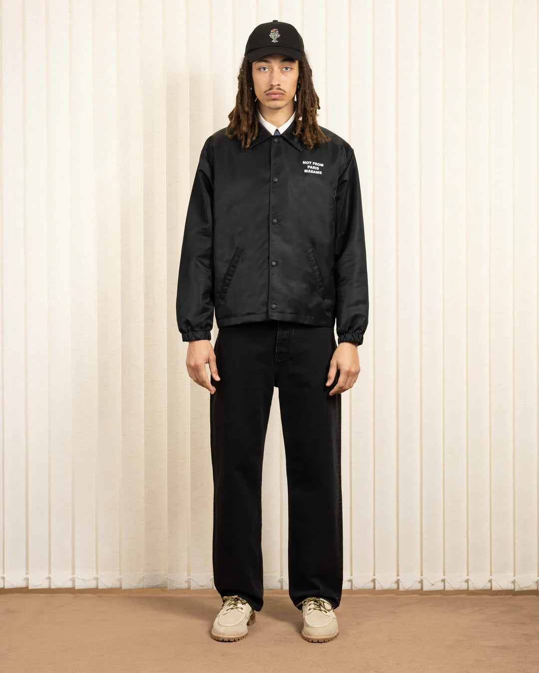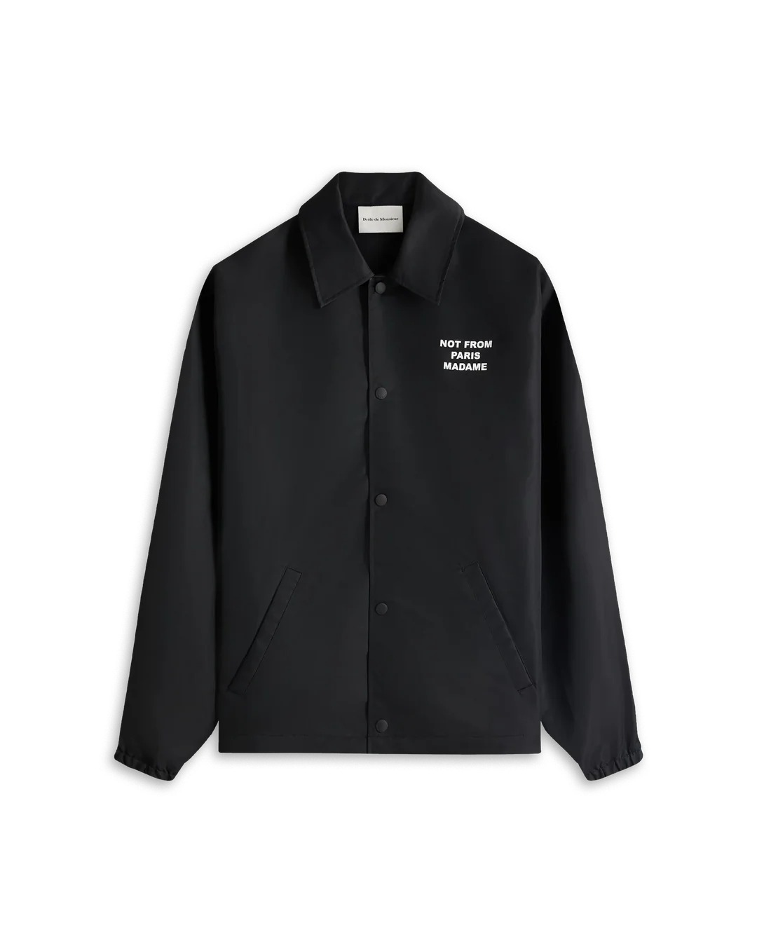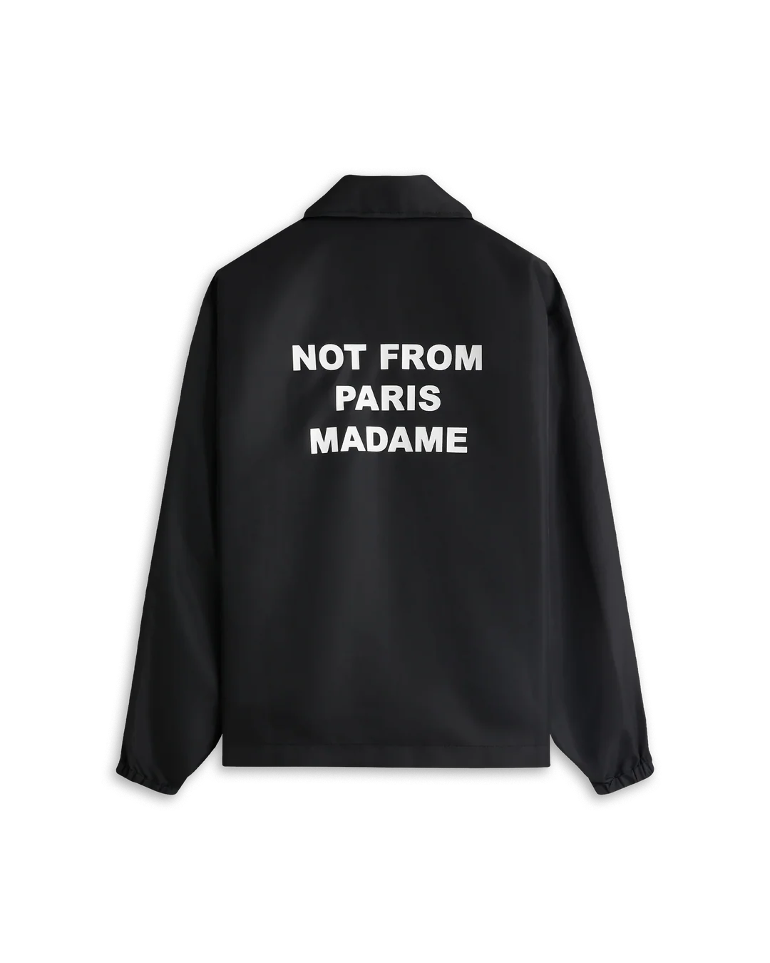 A timeless piece. This black water-repellent jacket with elasticated wrists and engraved snap buttons is printed with the 'Not From Paris Madame' slogan front and back.
