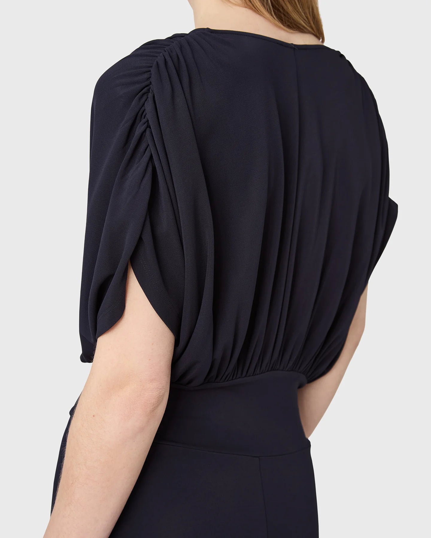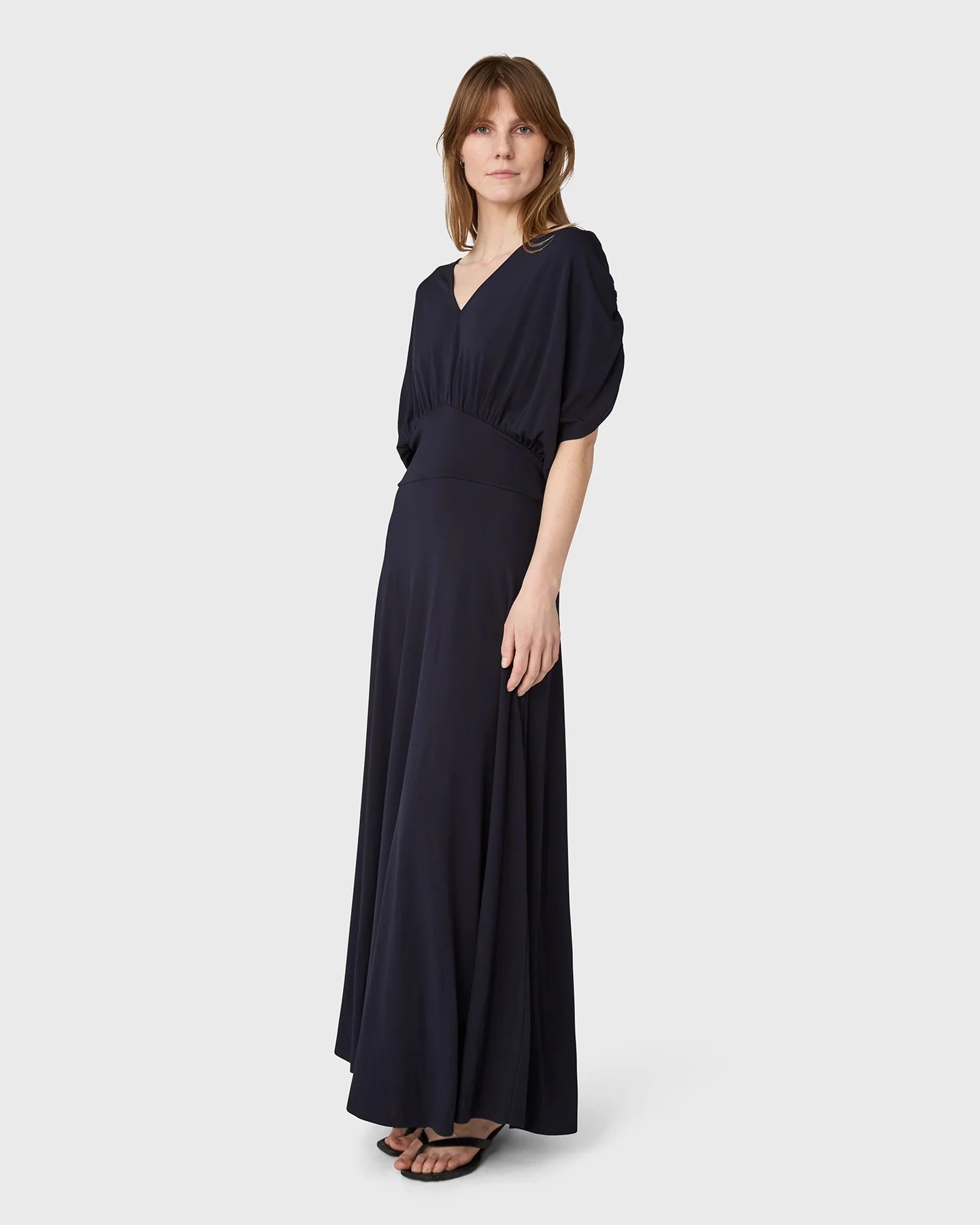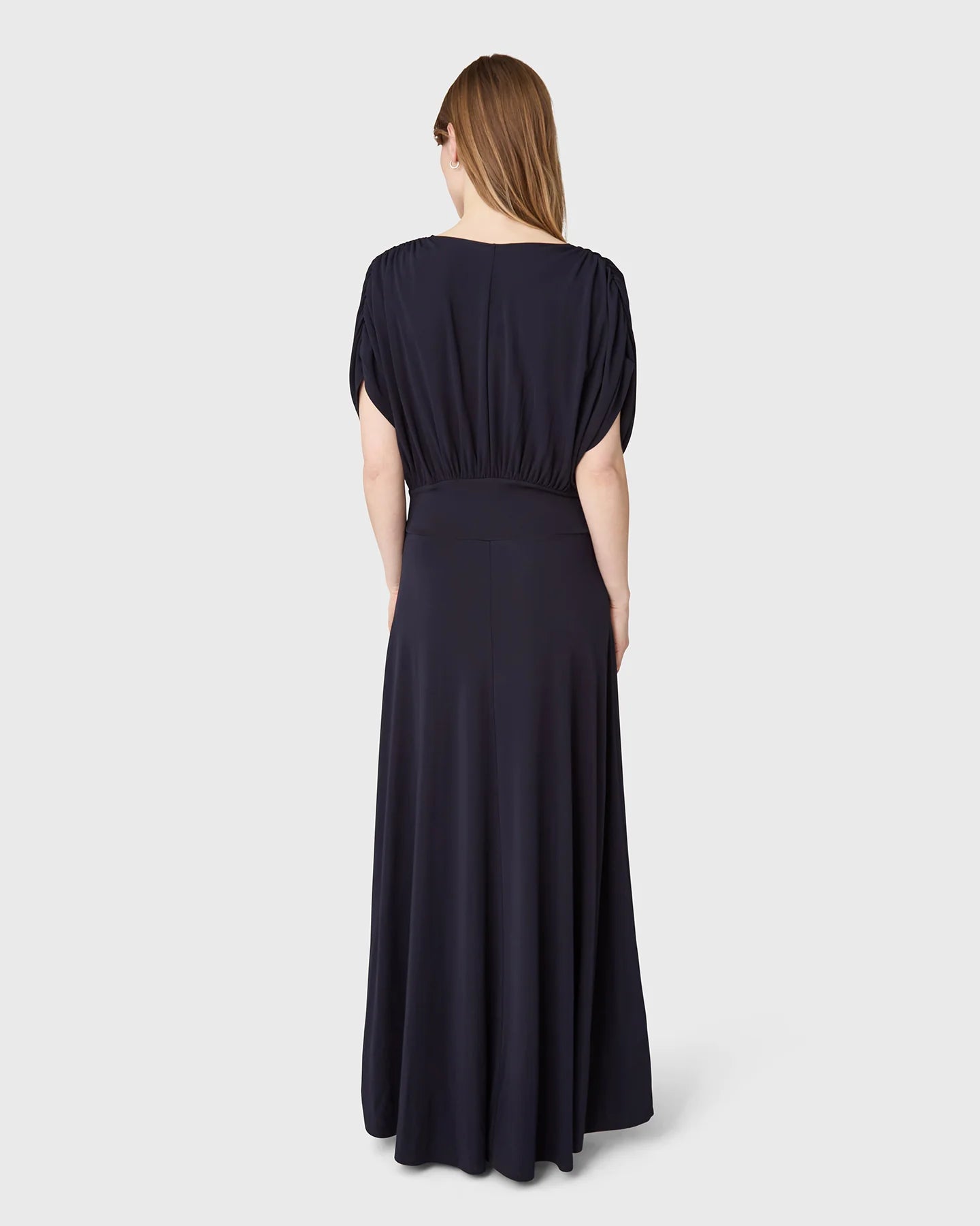 Klänning med V-ringning i vår viskosjersey, med draperade axlar och lång vid kjol. Perfekt sommarklänning för både bröllopet och sommarfesten.