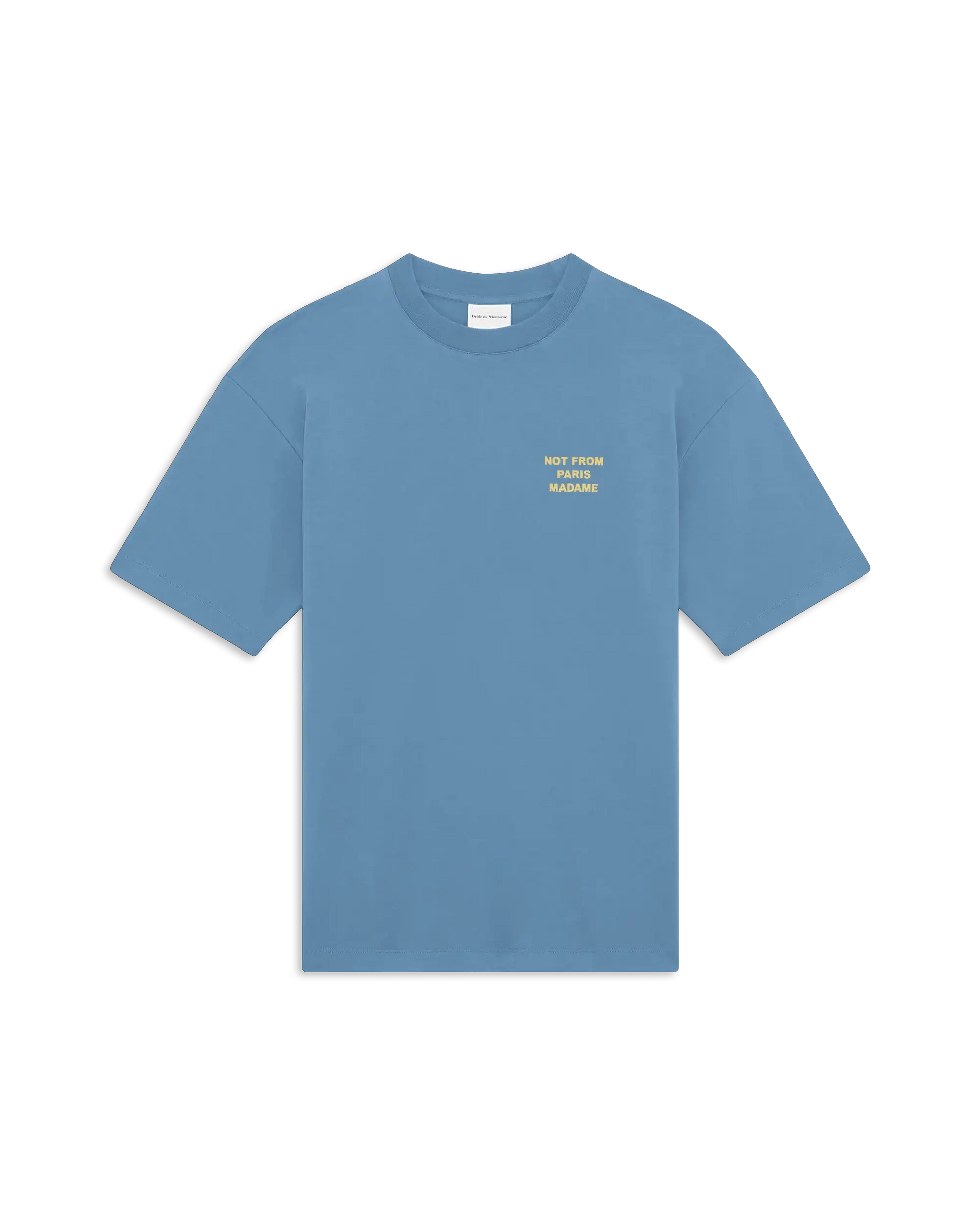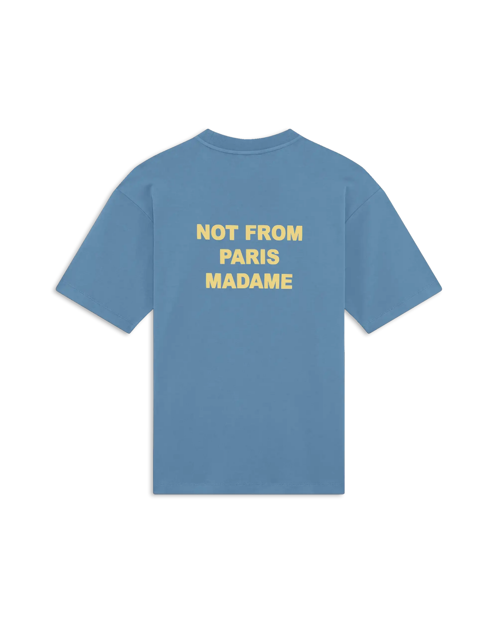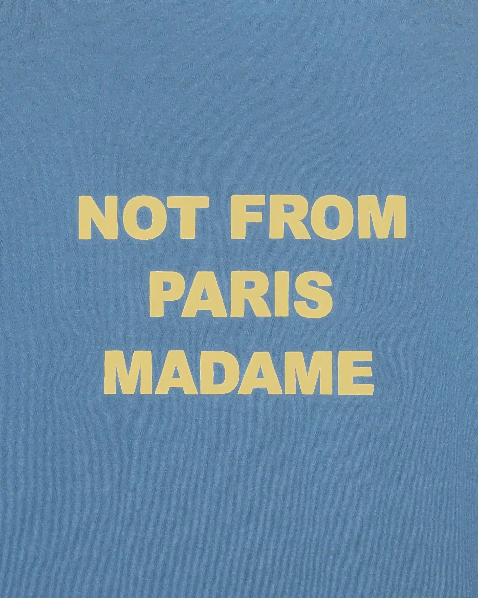 The Slogan tee. Made of 100% cotton interlock fabric, this blue t-shirt features a ribbed neckline and the 'Not from Paris Madame' slogan printed front and back.